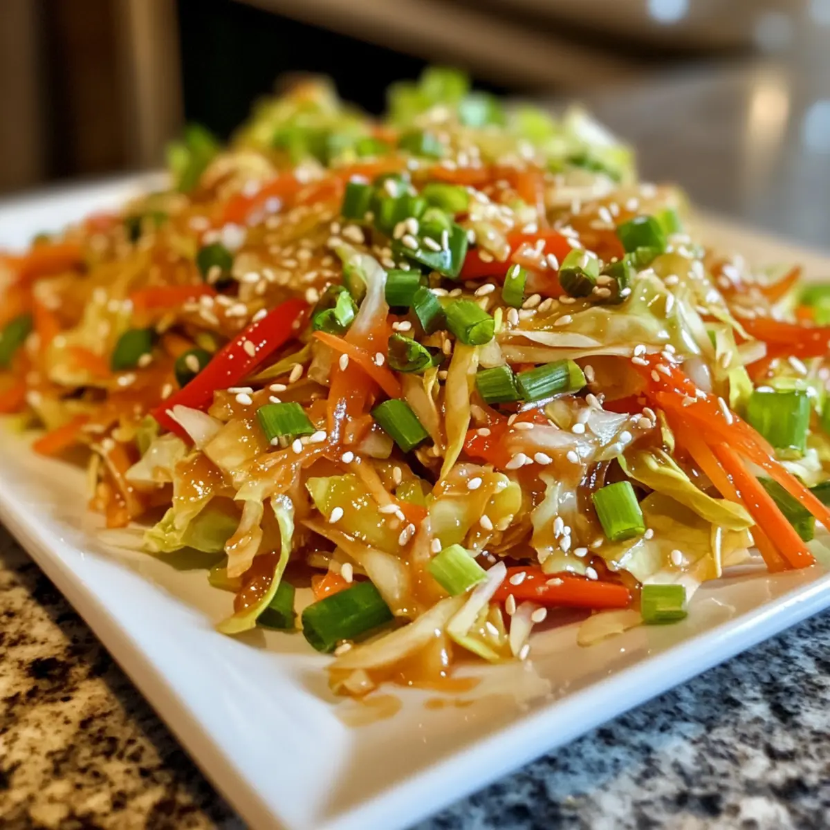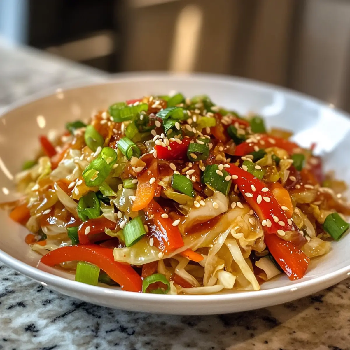 Remove the skillet from heat and transfer the finished Asian Cabbage Stir Fry to a serving dish. Garnish with sliced green onions and a sprinkle of toasted sesame seeds for an added touch of flavor and color. Serve immediately while hot, showcasing this vibrant and healthy meal to enjoy!
