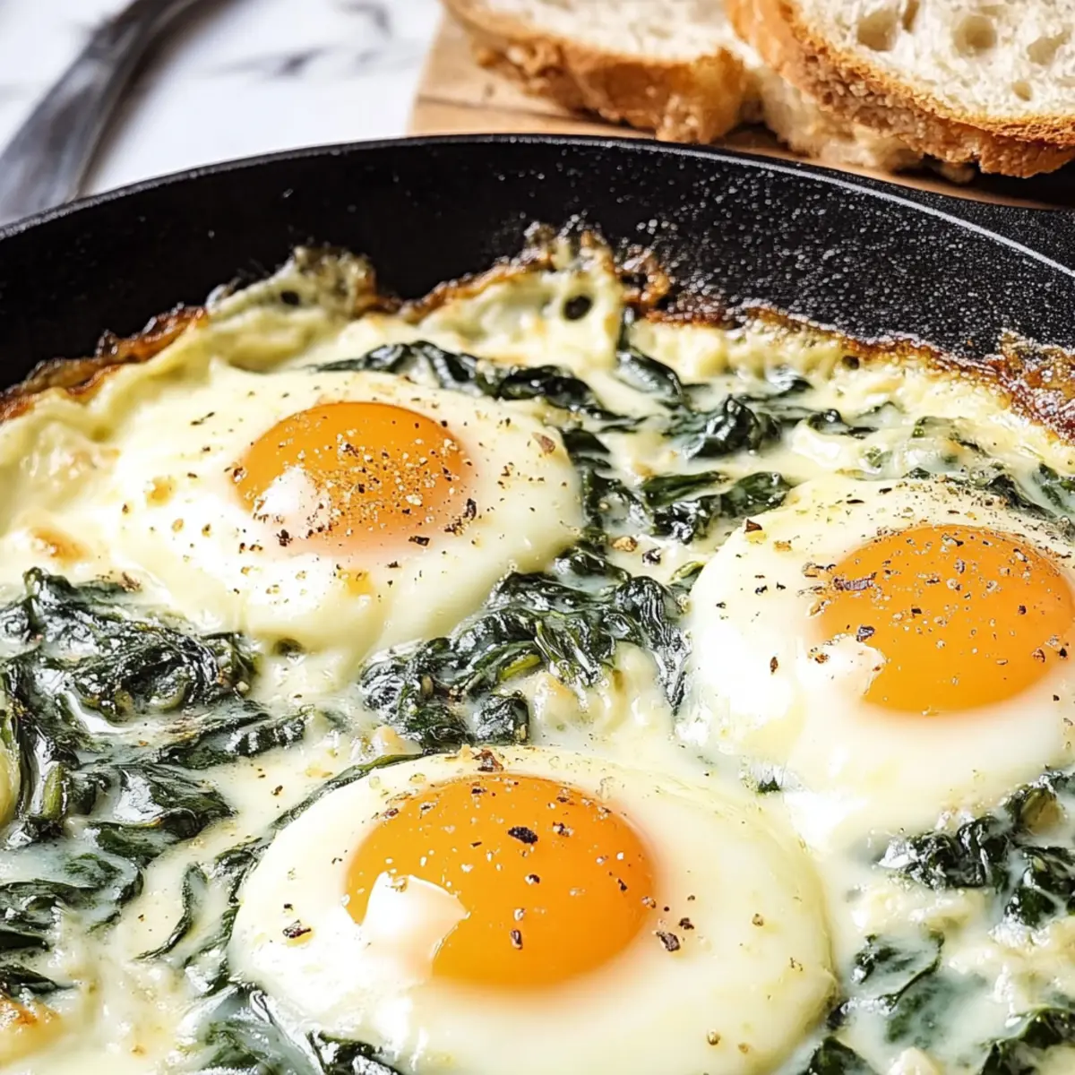 - Create four wells in the spinach mixture and crack an egg into each well, seasoning with salt and pepper.