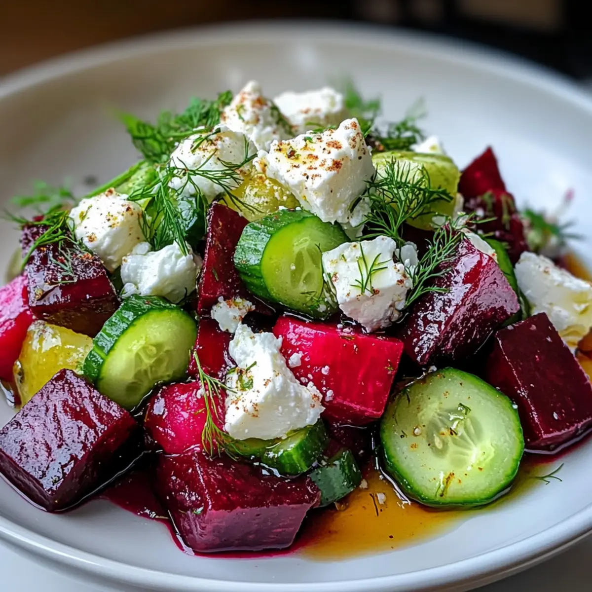 Vibrant Colors: The radiant mix of ruby beets, crisp cucumbers, and creamy feta makes this salad a feast for the eyes.