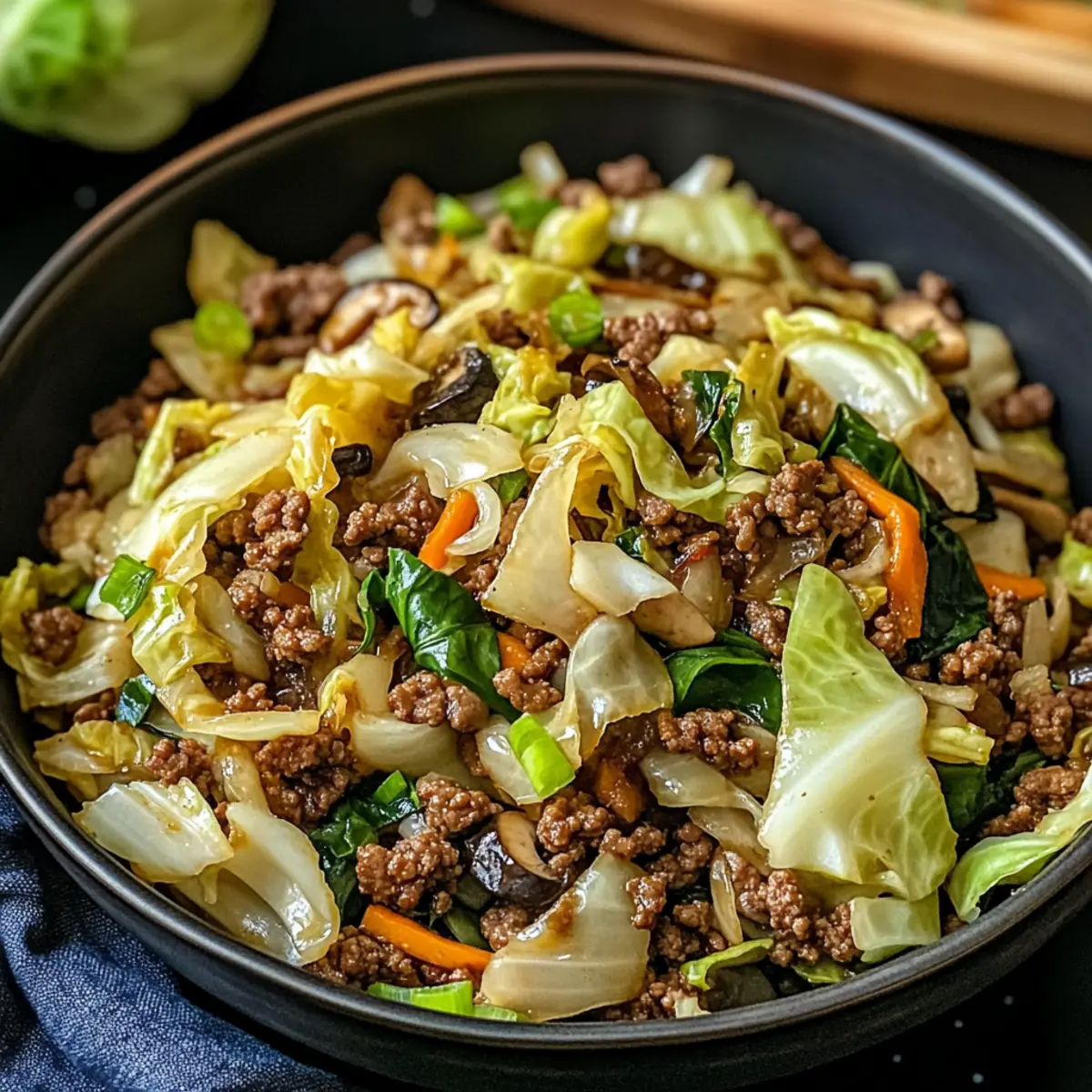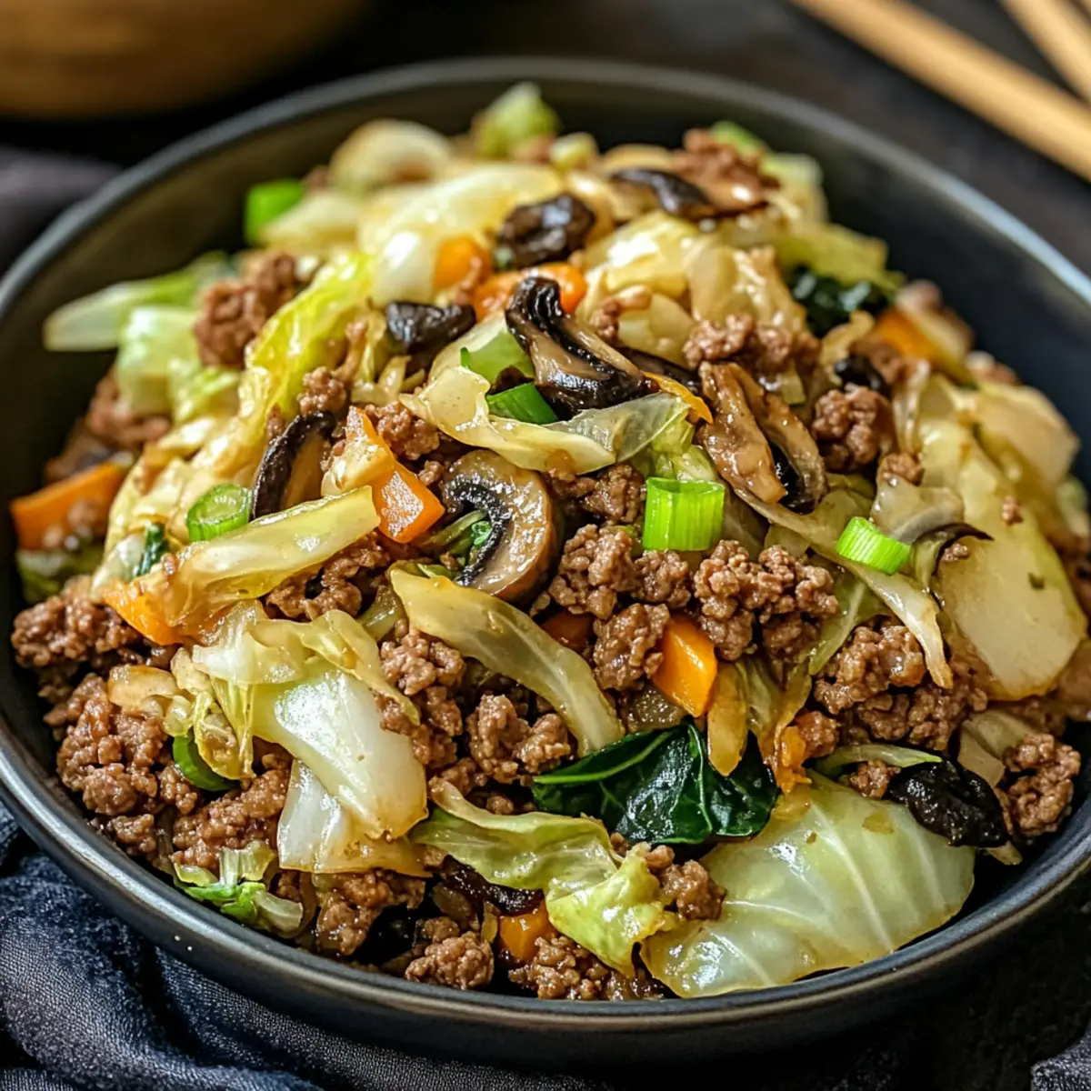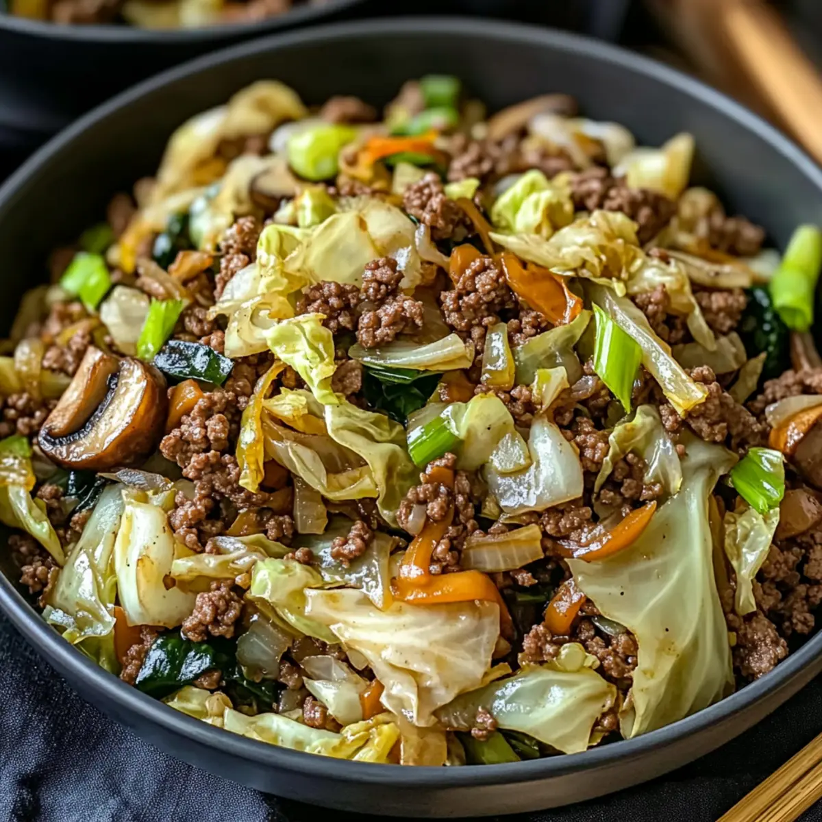 These Chinese Ground Beef and Cabbage Stir Fry ingredients are ideal for meal prep, saving you time on busy weeknights! You can chop the cabbage, shiitake mushrooms, and green onions up to 24 hours in advance. Store them in an airtight container in the refrigerator to maintain their freshness. The ground beef can also be cooked up to 3 days ahead and refrigerated; just reheat it gently before adding the fresh veggies. When ready to enjoy, simply stir-fry the prepped vegetables with the reheated beef, adding the garlic, ginger, soy sauce, and sesame oil as you normally would. This method allows you to create a delicious and satisfying meal with minimal effort!