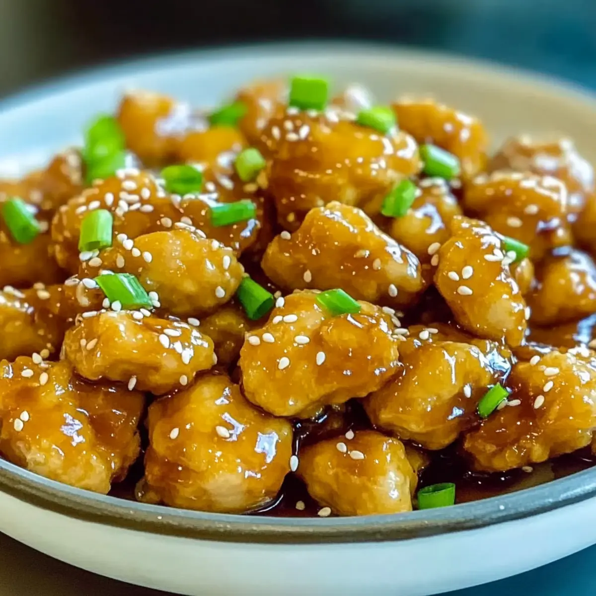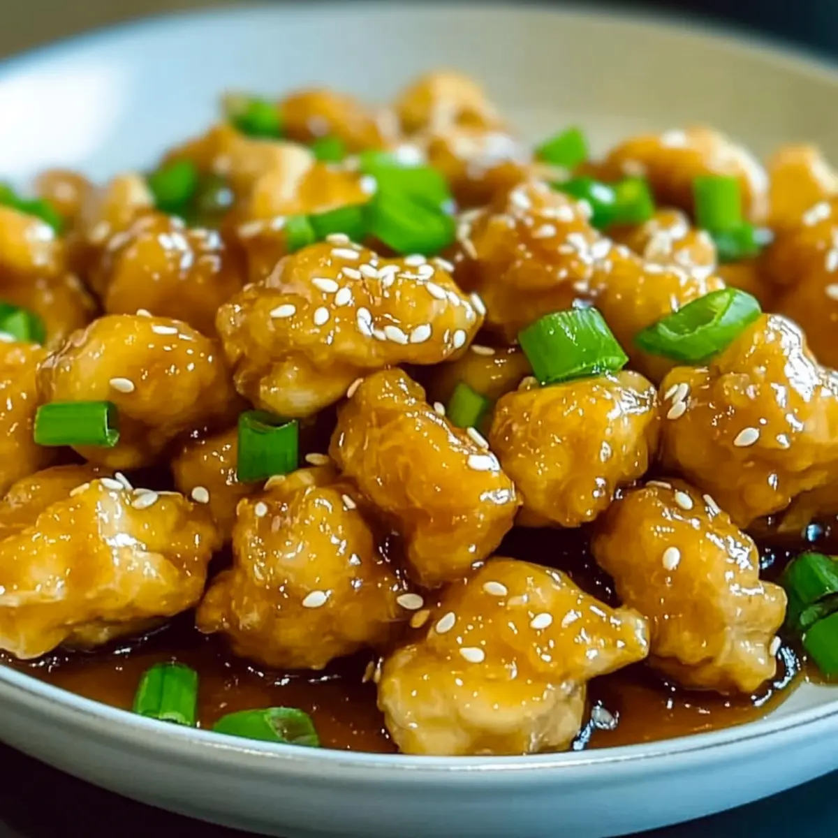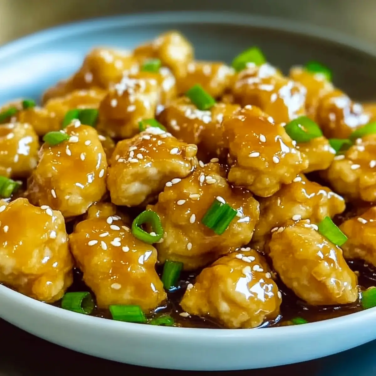 - Once the sauce is ready, add the crispy fried chicken to the saucepan. Gently toss to coat each piece in the glaze. Transfer to a serving plate and garnish with sesame seeds, sliced green onions, and grated lemon zest. Serve warm.