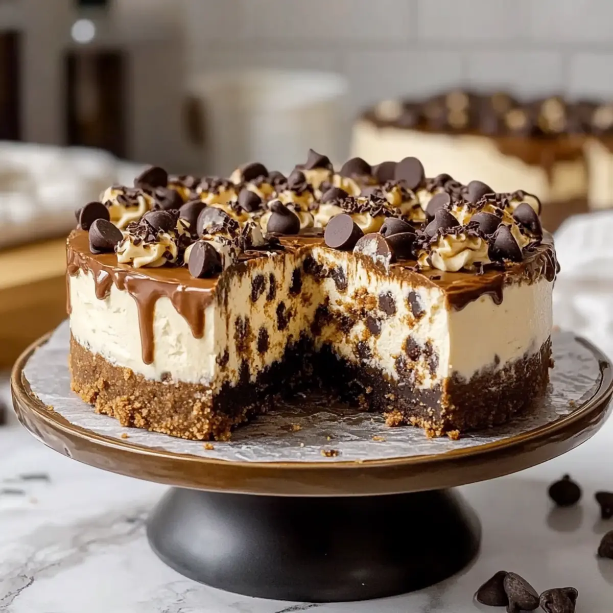 Once the ganache has settled, pour it over the top of the chilled cheesecake, allowing it to drip down the sides. Pipe the whipped cream on top, then adorn with the remaining cookie dough balls and extra mini chocolate chips for that gorgeous finishing touch.