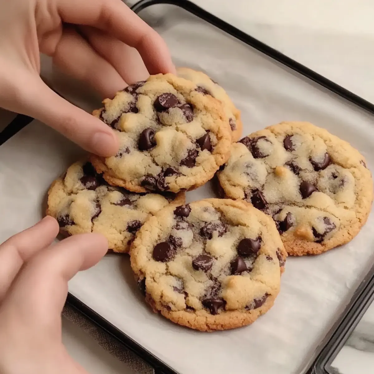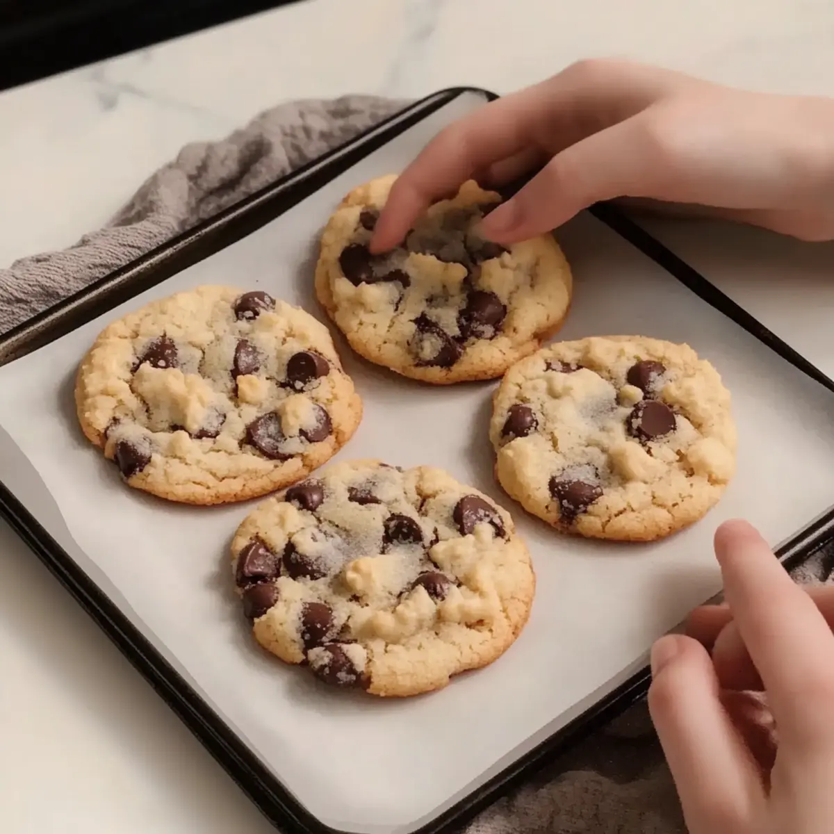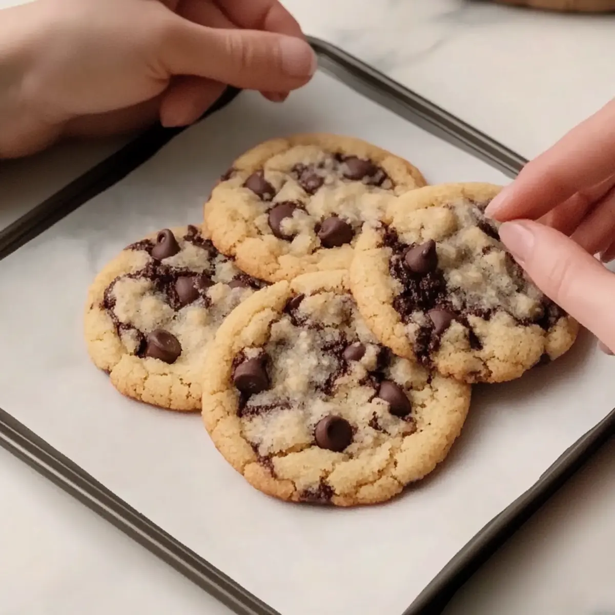 Once preheated, place 3-4 cookie dough balls on a parchment-lined baking sheet. Bake for 9-11 minutes, or until the tops are golden brown but the centers still look soft and undercooked. The cookies will continue to set as they cool, ensuring that melt-in-your-mouth experience everyone loves.