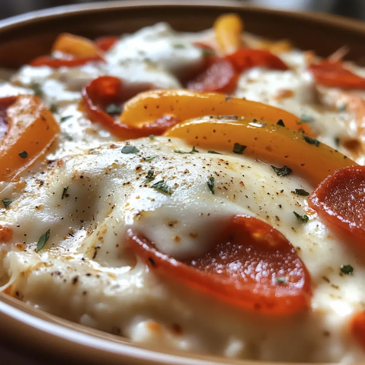 - Transfer the mixture to an oven-safe bowl. Top with mozzarella cheese and additional pepperoni if desired.