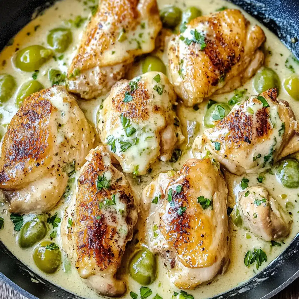 Pour in 1 cup of low-sodium chicken broth and ½ cup of heavy cream to the skillet. Increase the heat slightly, bringing the mixture to a gentle simmer. Stir carefully and let it bubble for about 5-7 minutes, allowing the sauce to thicken and become velvety. The creamy, tangy sauce will envelop those tasty chicken pieces beautifully.