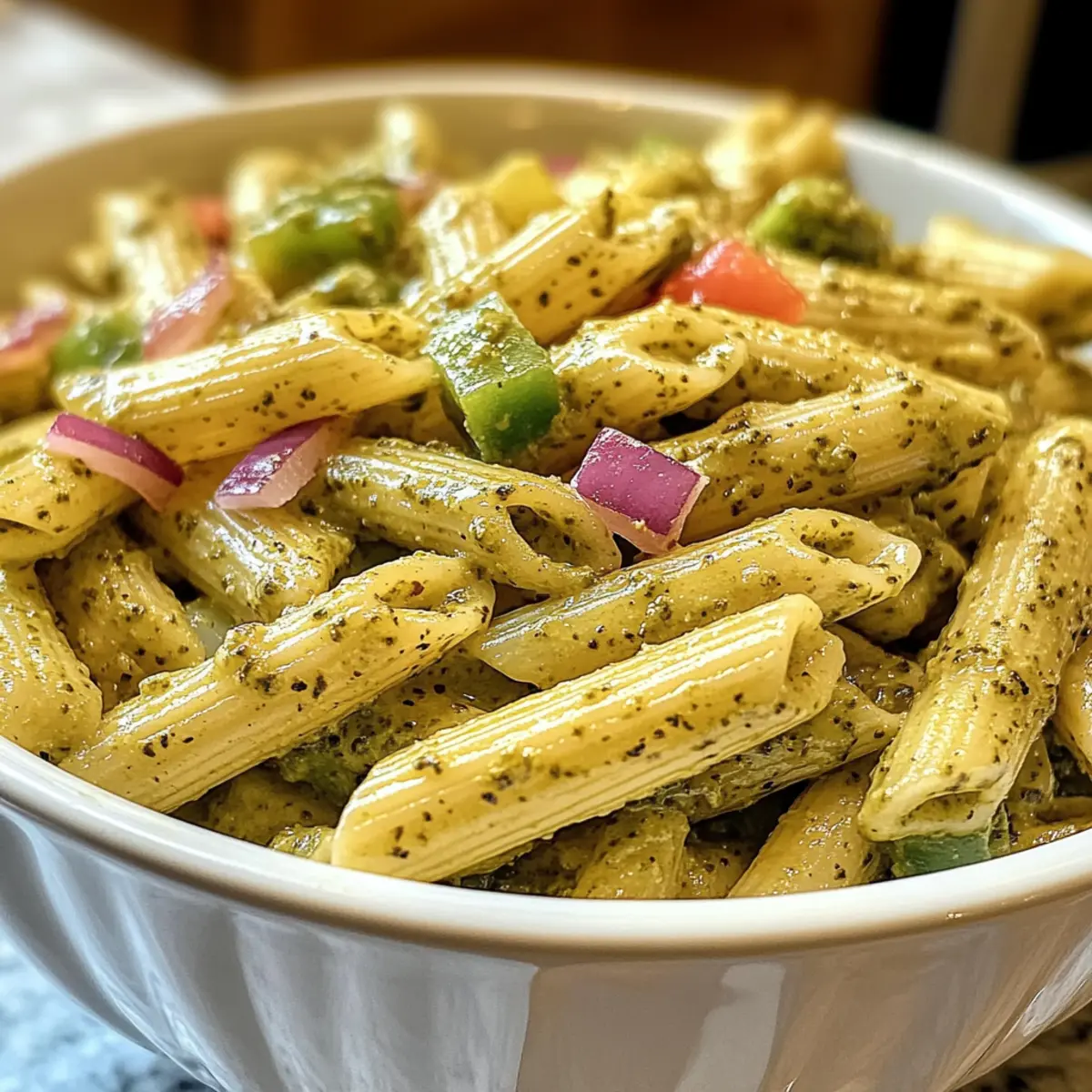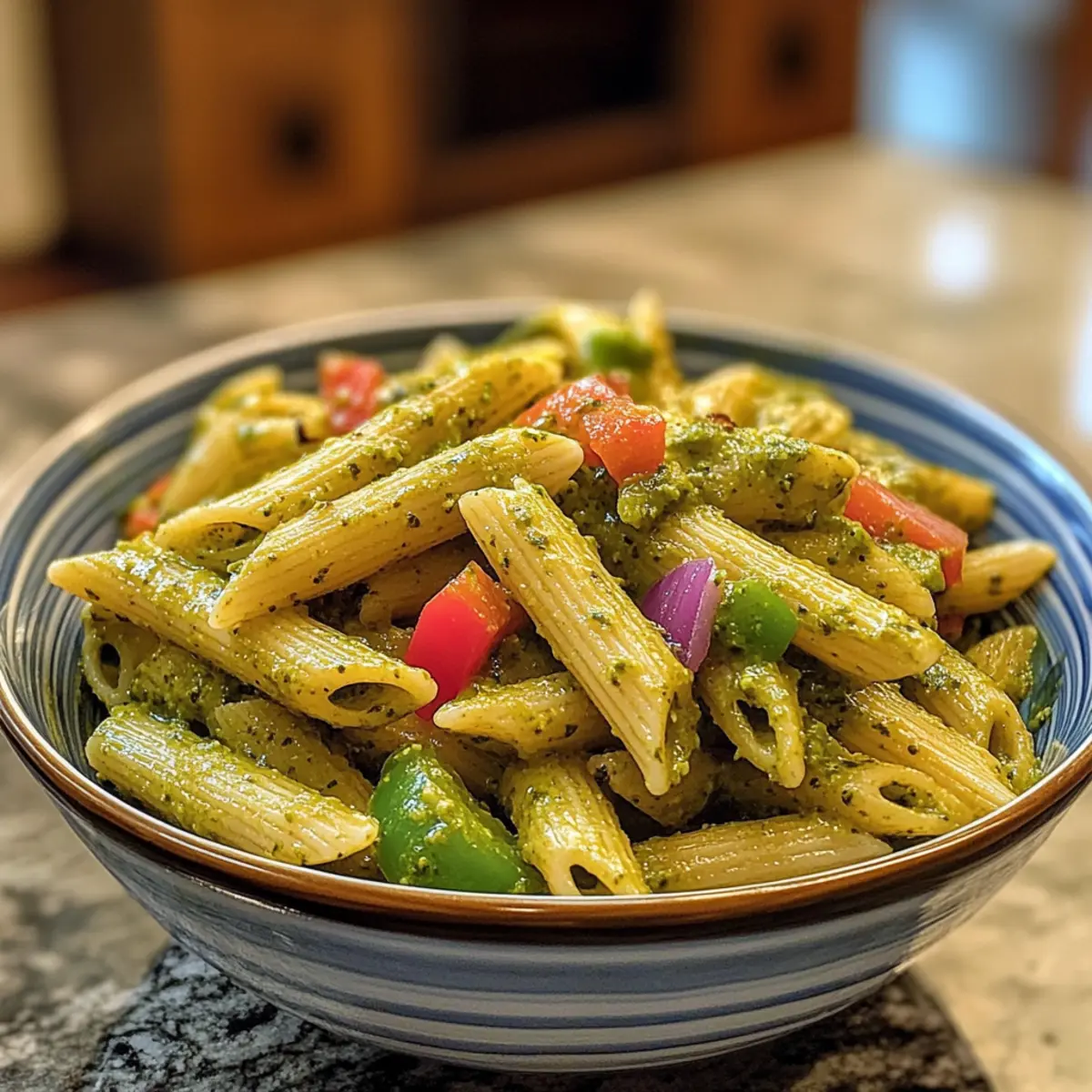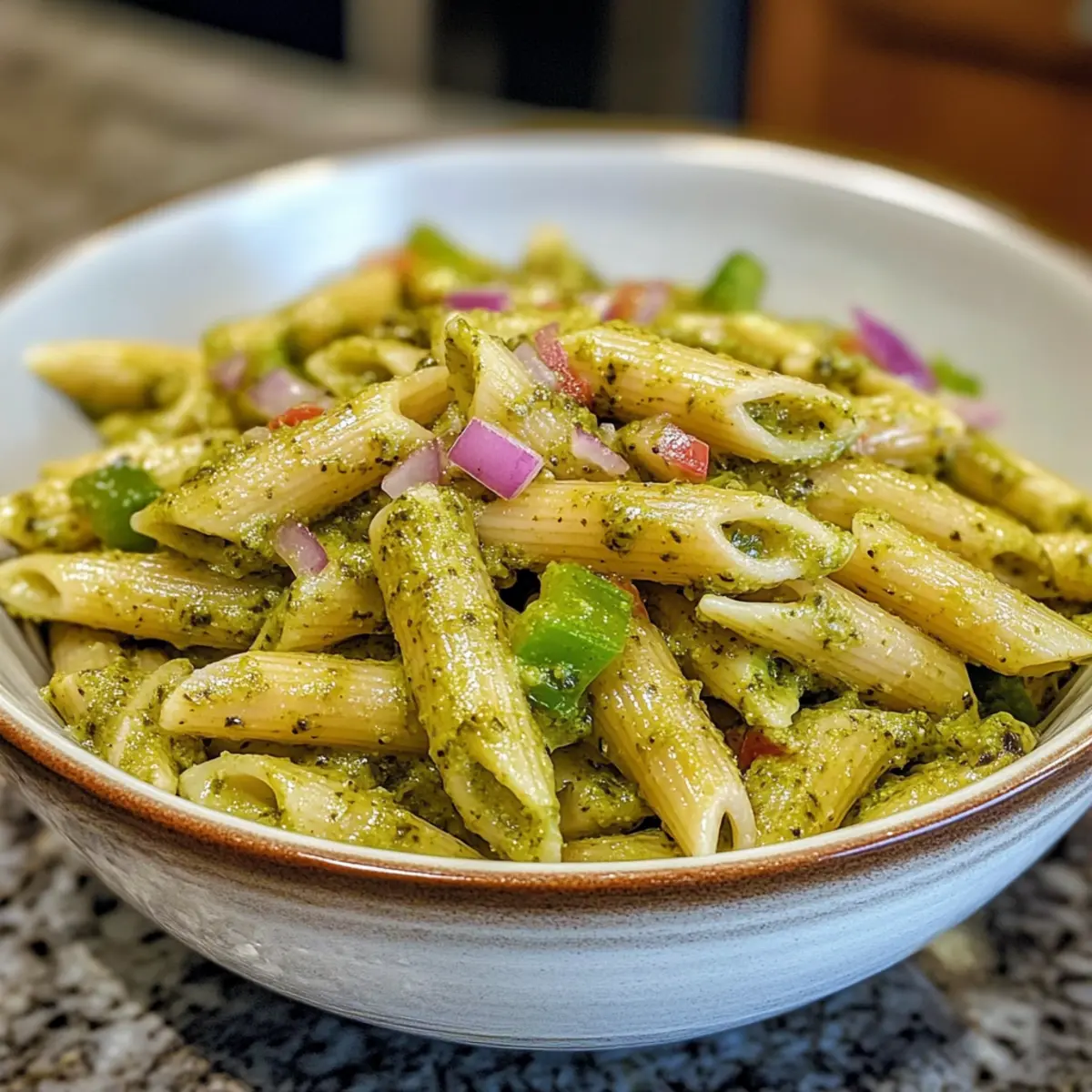As the sun sets and my kitchen fills with the scent of garlic and herbs, I can’t help but smile knowing I’m about to whip up a bowl of creamy pesto sauce pasta. In just one pot and about five minutes, I transform simple penne into a vibrant dish bursting with fresh flavors from sautéed green bell peppers and red onions, all coated in a velvety sauce. This quick meal is perfect for those hectic weeknights when you crave something comforting yet effortless. Plus, it’s a versatile crowd-pleaser that can easily cater to any dietary preferences. Are you ready to elevate your pasta game with a touch of elegance and simplicity? Let’s dive in!