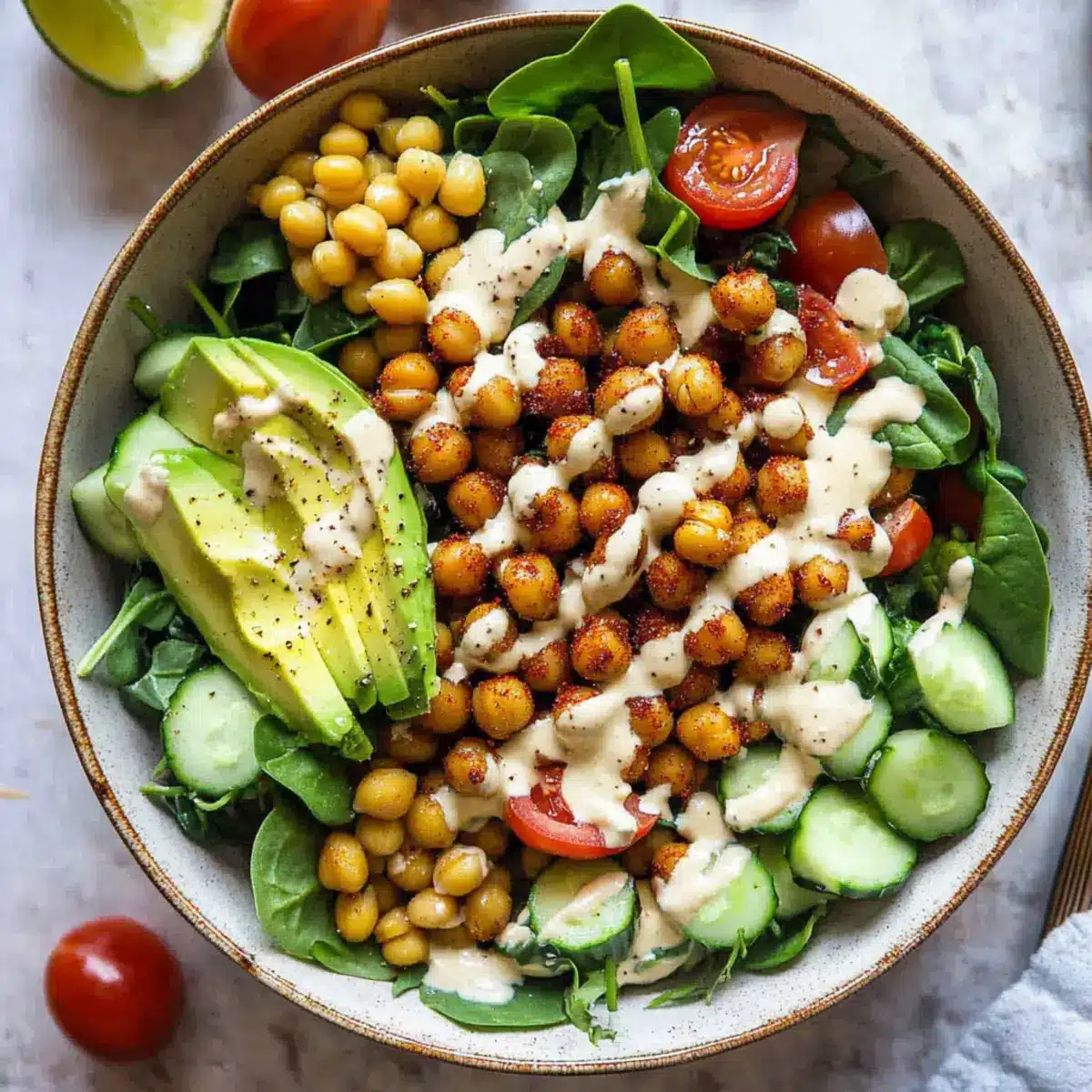 In a separate small bowl, whisk together tahini, the juice of one fresh lime, honey (or agave for a vegan option), and a pinch of salt. Mix until the dressing is smooth and creamy, adjusting the flavors to your preference. This dressing will tie together the crisp and fresh elements of your Crispy Chili Lime Chickpea Salad.