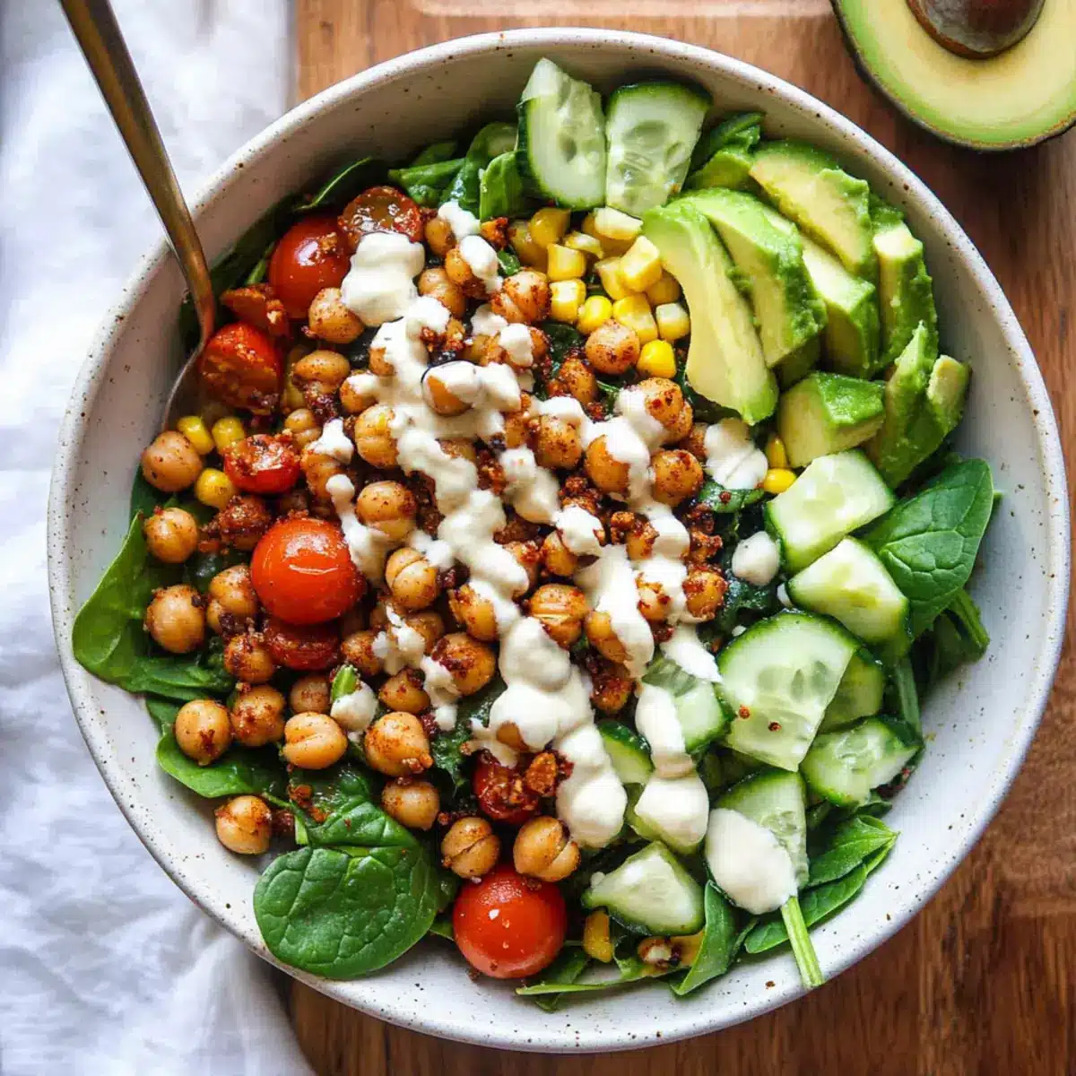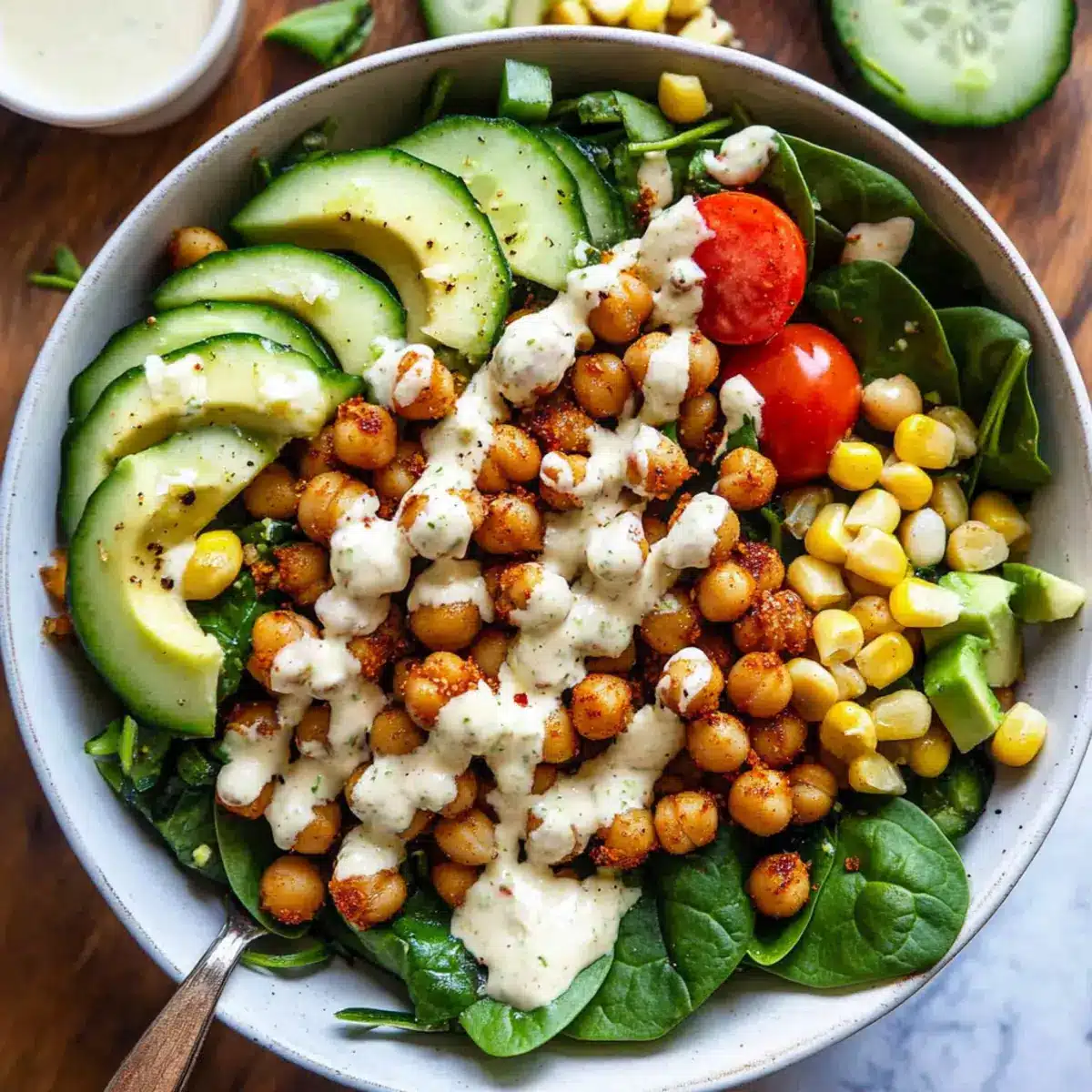 While the chickpeas are roasting, it’s time to layer the salad. In a large bowl, start with a generous base of chopped spinach. Then, add halved grape tomatoes, corn, diced cucumber, and chopped walnuts. Each ingredient brings its own flavor and texture, creating a colorful and nutritious blend for your salad.