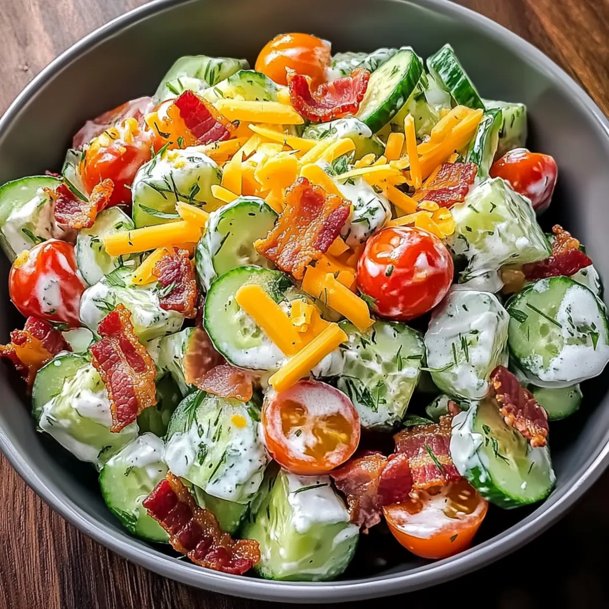 Pour the dressing mixture over the salad ingredients. Gently toss everything together until every piece of cucumber, tomato, and bacon is coated with the creamy dressing, ensuring a harmonious balance in every bite of your fresh salad.