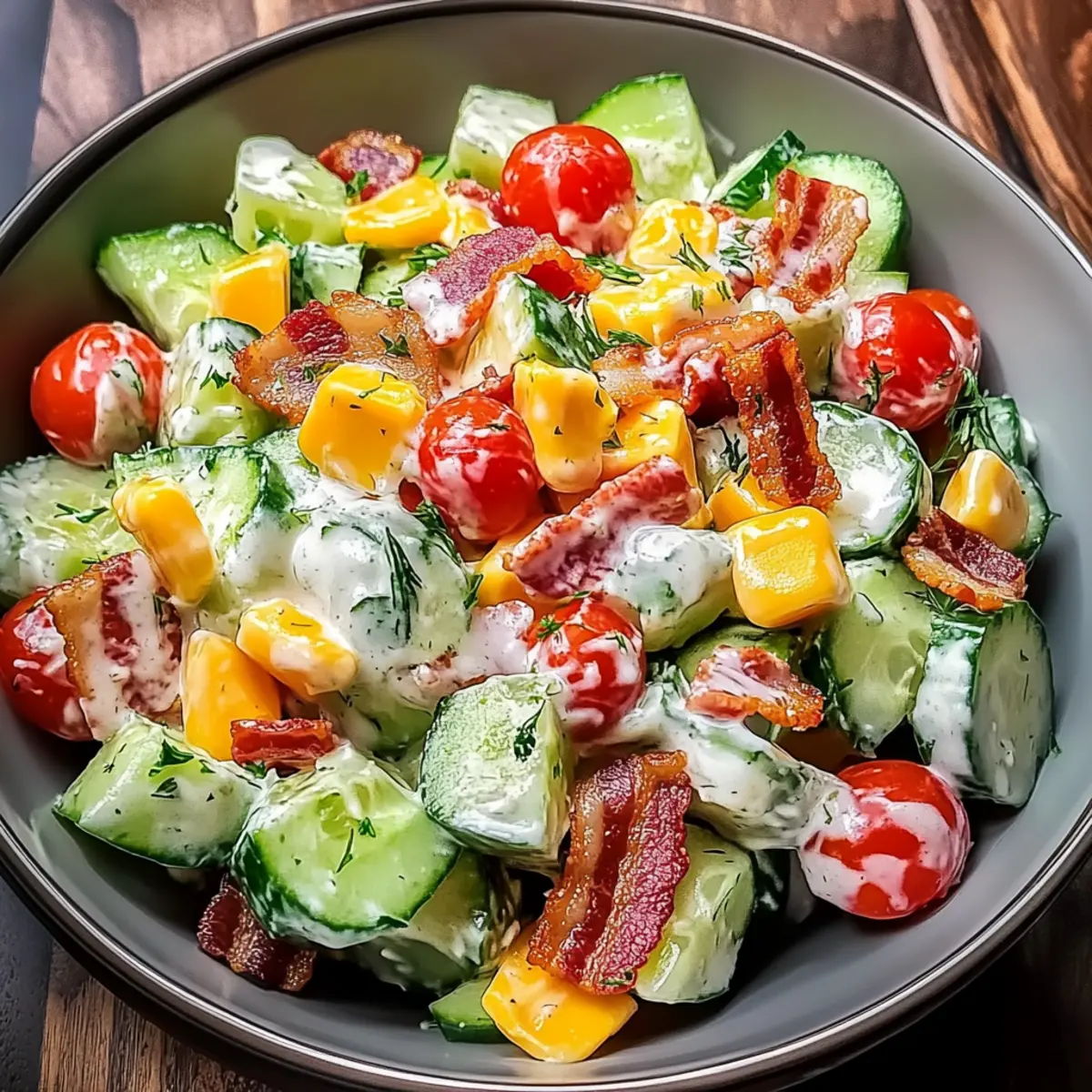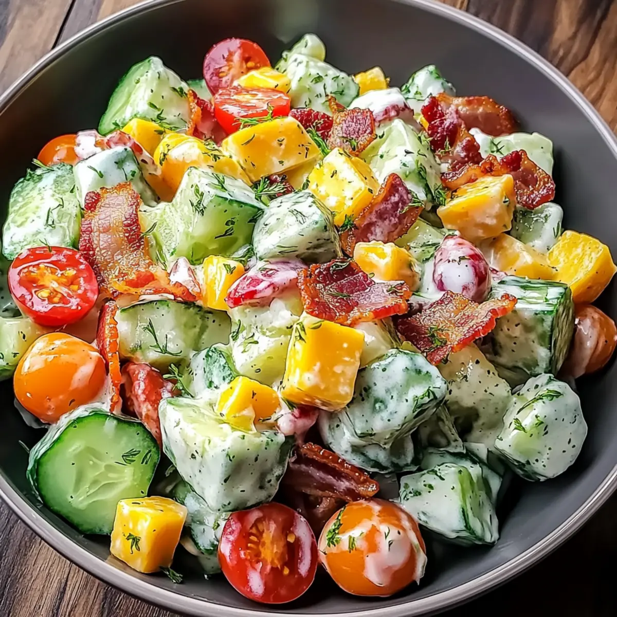 Store your salad in an airtight container in the fridge for up to 48 hours. To keep it fresh, press plastic wrap directly onto the salad surface before sealing the lid. This helps retain the crunch of the cucumbers and bacon.