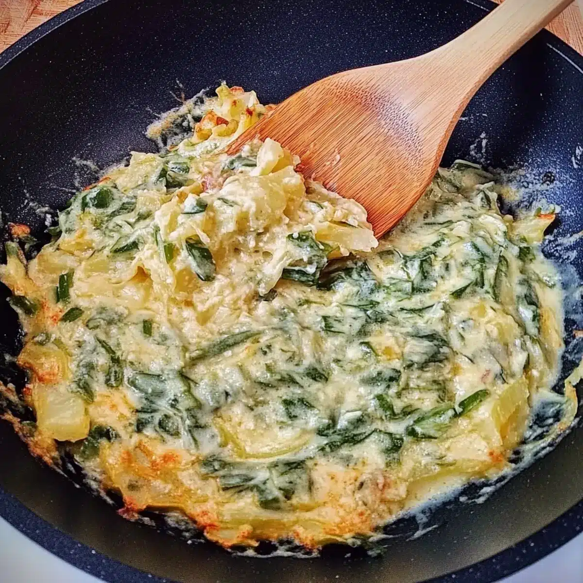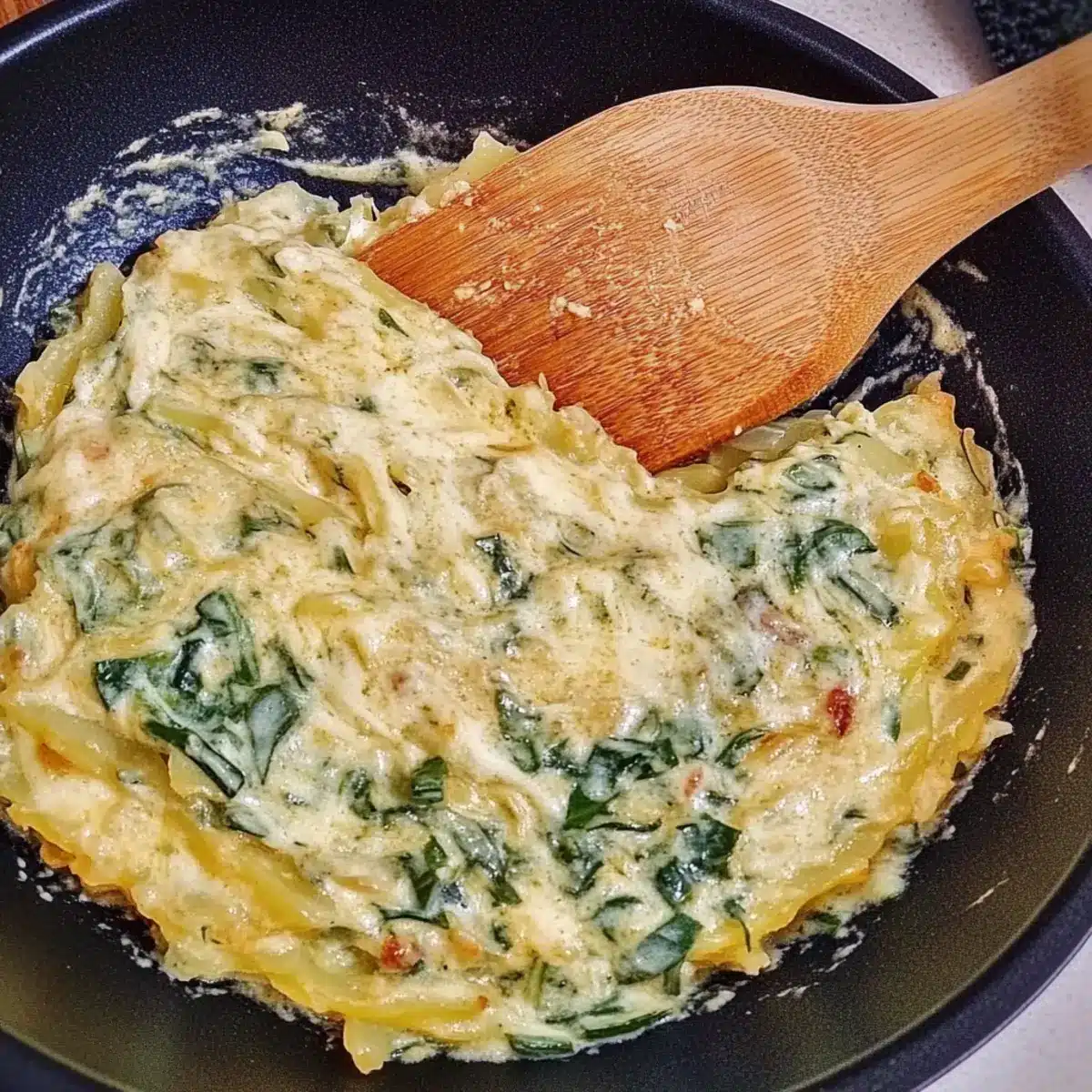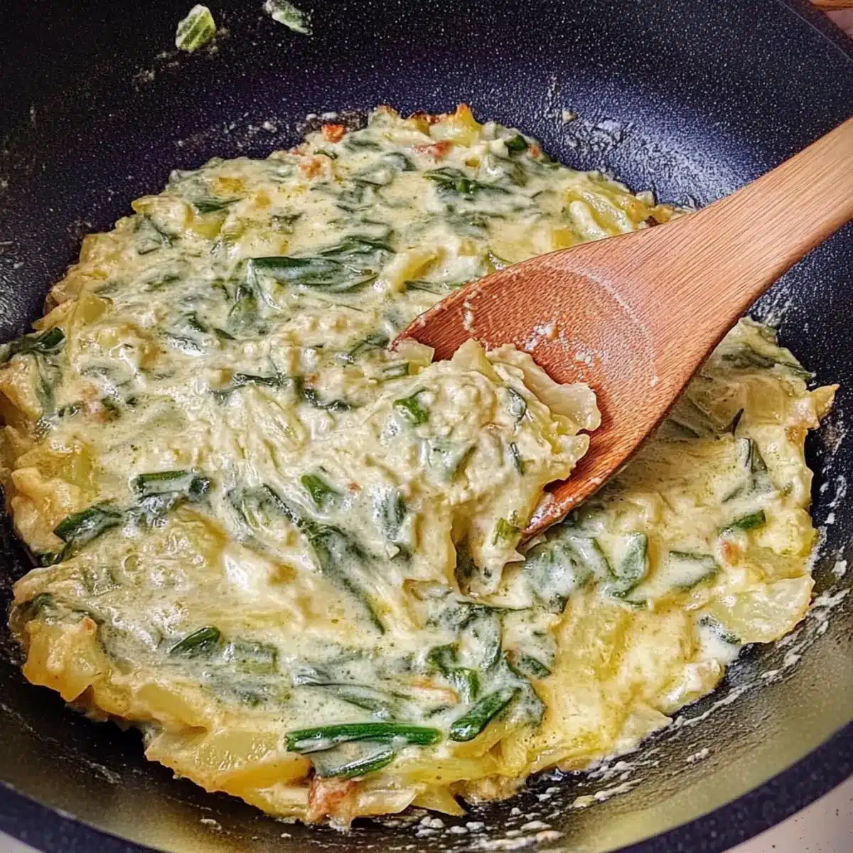 - Fold the prepared spinach into the creamy mixture and heat through, stirring occasionally for 2-3 minutes.