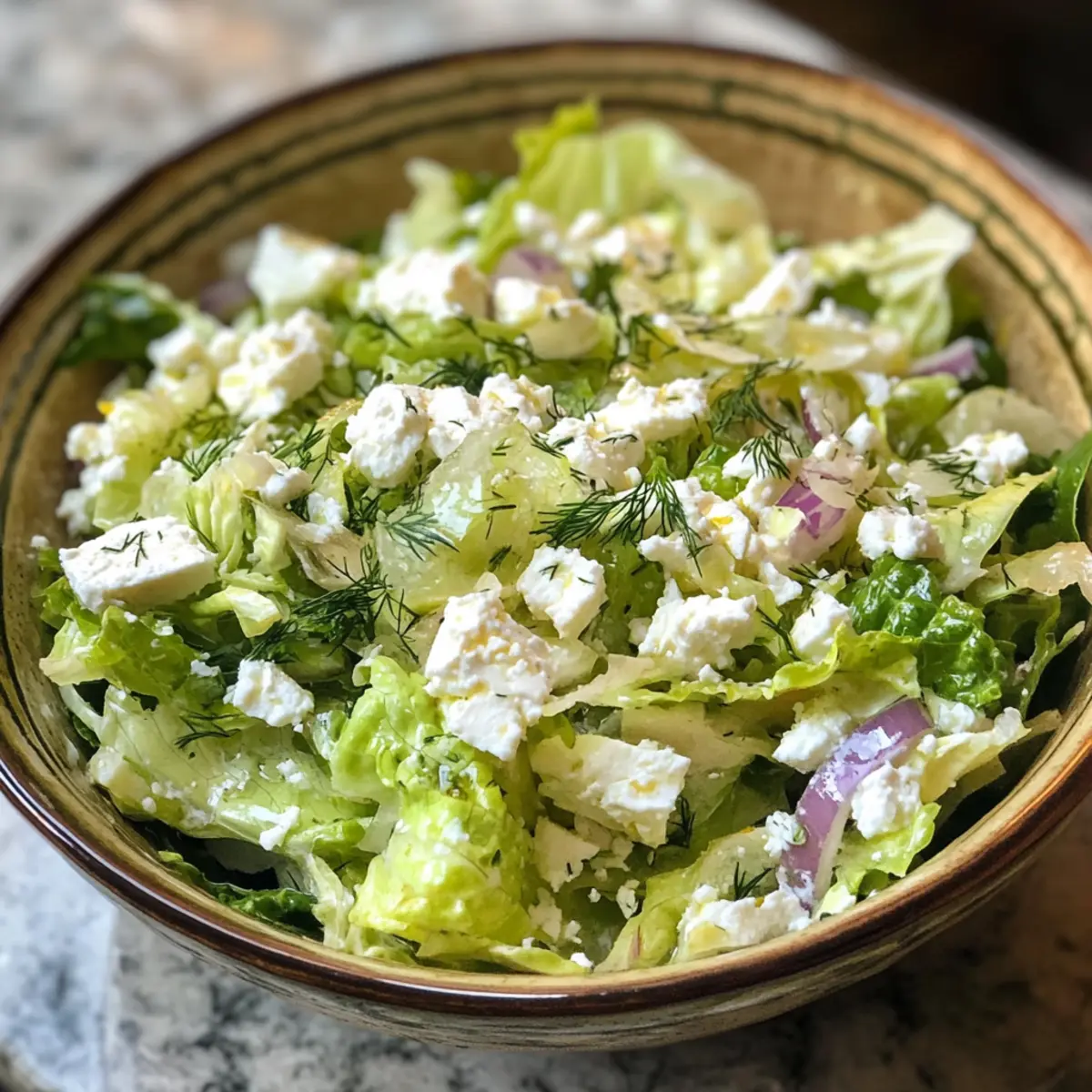 - In a large salad bowl, combine chopped romaine, finely sliced shallot, dill, and crumbled feta. Toss gently.