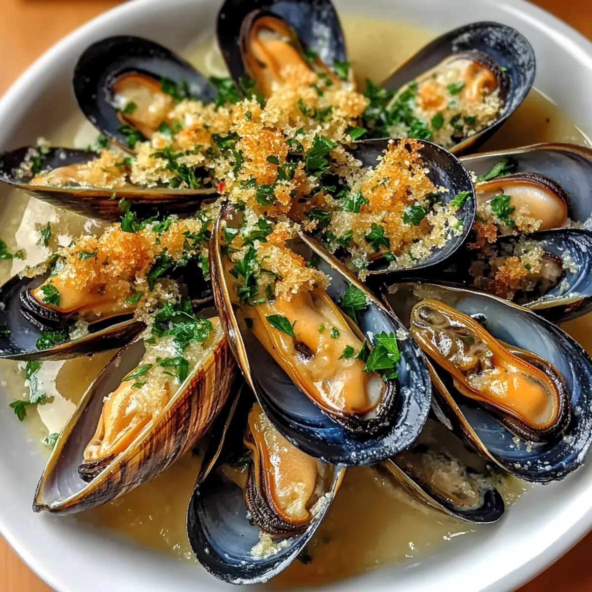 Once your Garlic Butter Mussels are beautifully broiled, remove them from the oven and garnish with extra chopped parsley for a pop of color. Serve immediately with crusty bread on the side, perfect for dipping into the savory garlic butter. The dish is best enjoyed fresh, allowing everyone to relish the delightful seafood experience!