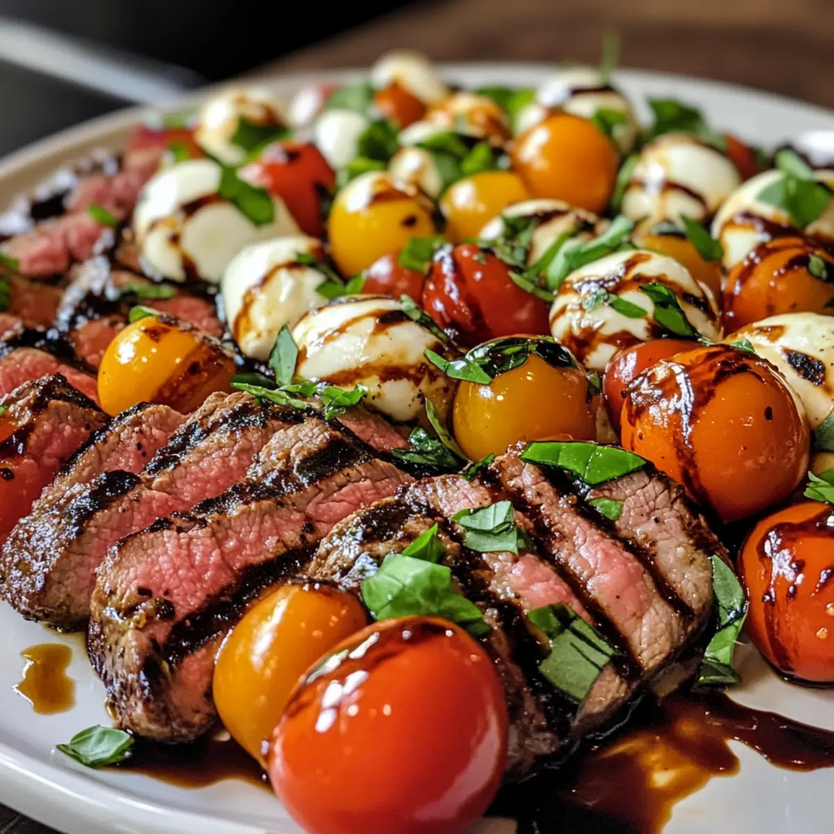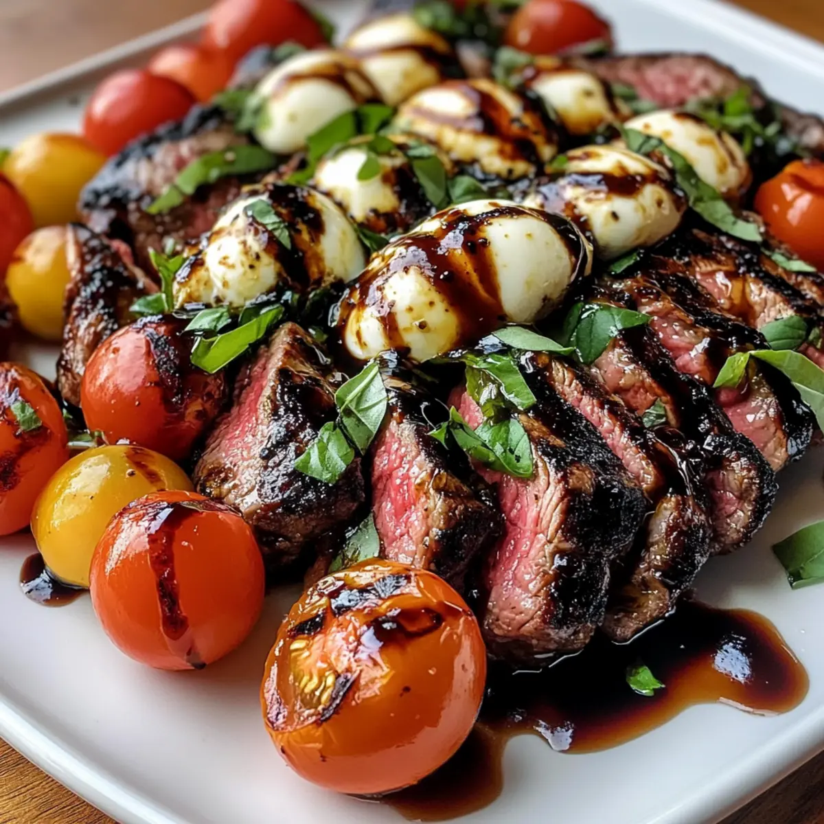- Arrange the sliced steak on a platter alongside the Caprese salad and drizzle with balsamic glaze before serving.