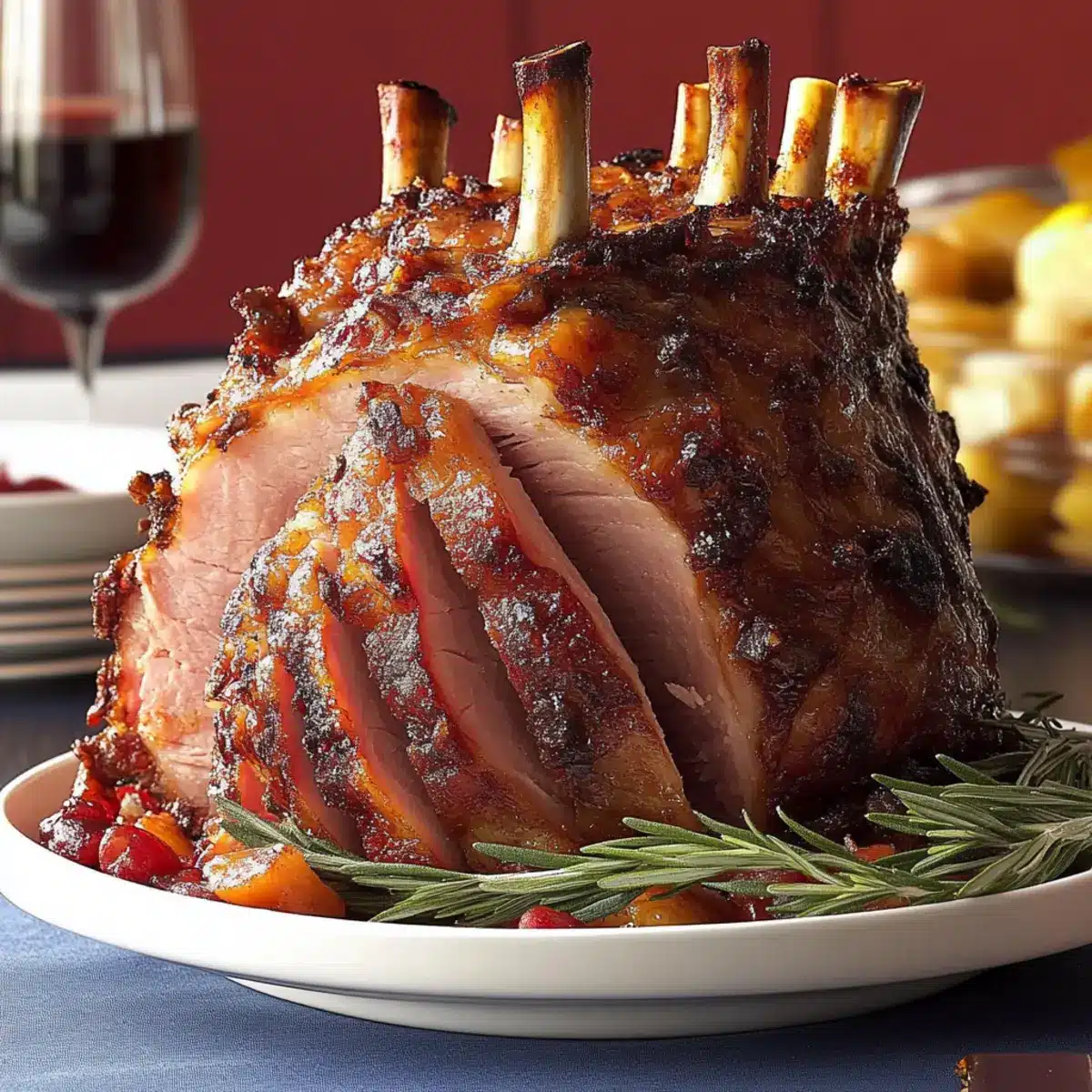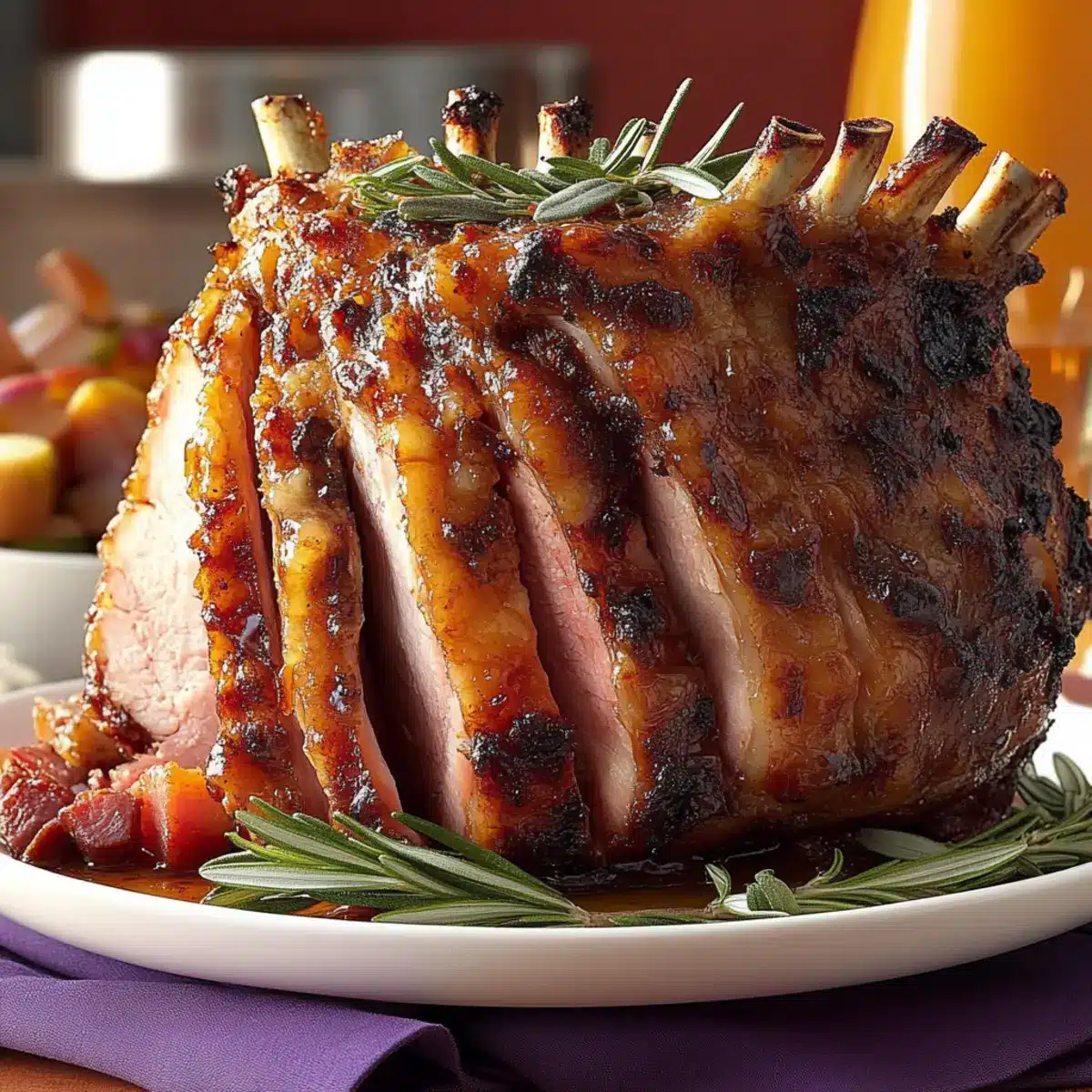 The Holiday Crown Pork Roast is perfect for meal prep, allowing you to enjoy more time with family during the festivities! You can prepare the herb rub (combine minced garlic, fresh herbs, salt, and pepper) and apply it to the roast up to 24 hours in advance; simply refrigerate it tightly wrapped. Additionally, the glaze can be made ahead and stored in the fridge for up to 3 days. On the day of serving, let the roast come to room temperature, then sear it, glaze, and roast according to the original instructions. This advance preparation ensures each bite of your Holiday Crown Pork Roast remains just as flavorful and succulent, all while saving you valuable time during your holiday meal prep!