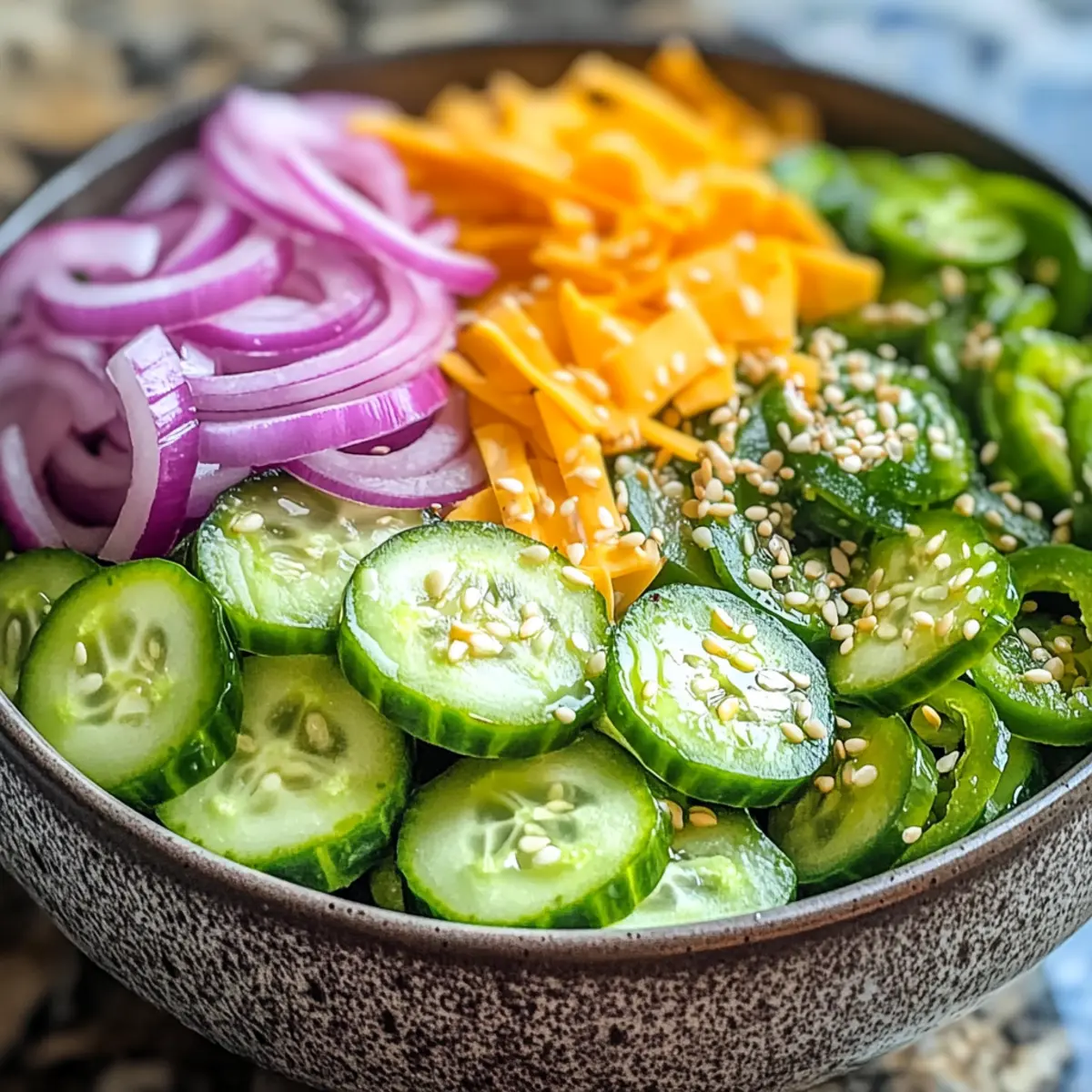 Transfer the vibrant salad to a serving plate and sprinkle sesame seeds on top for a delightful finish. For optimal flavor absorption, chill the salad in the refrigerator for 15-20 minutes before serving. This cooling time allows the creamy mixture to integrate with the cucumbers, ensuring a refreshing and satisfying experience as you enjoy your Jalapeno Popper Cucumber Salad.