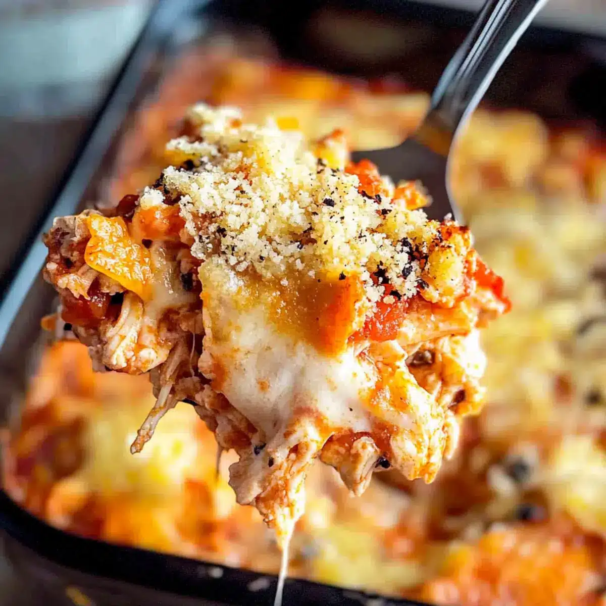 Spray a 9″ x 13″ casserole dish with non-stick cooking spray for easy removal later. Pour your chicken and marinara mixture into the prepared dish, spreading it evenly. The base will become a hearty layer, foundational for the cheesy topping that awaits.