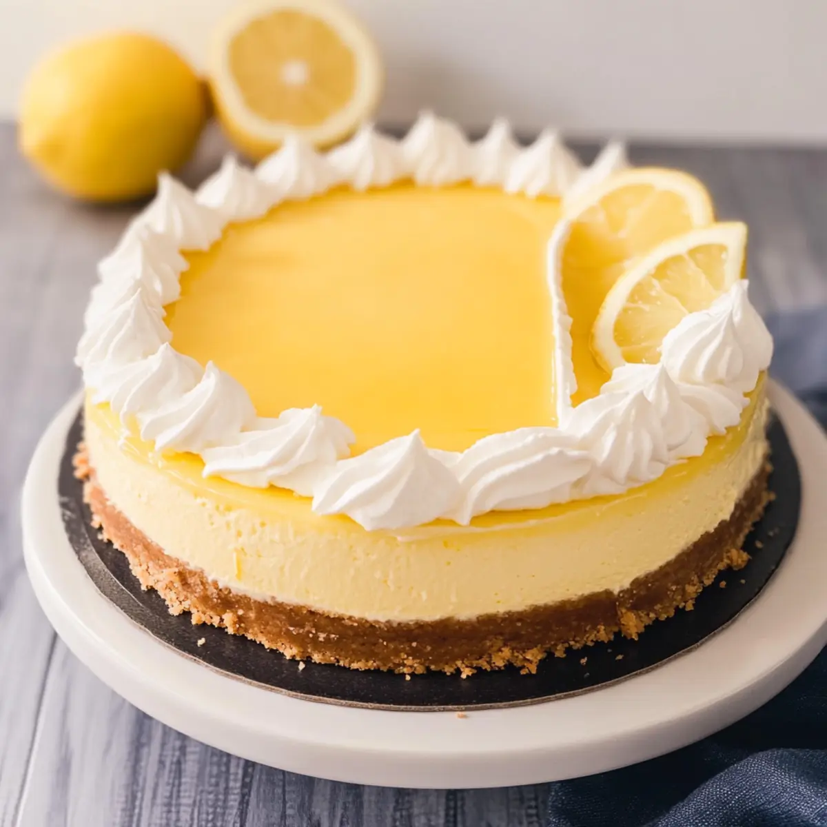 - Once the lemon curd has cooled, spread it evenly over the cheesecake. Garnish with whipped cream and lemon slices before serving.