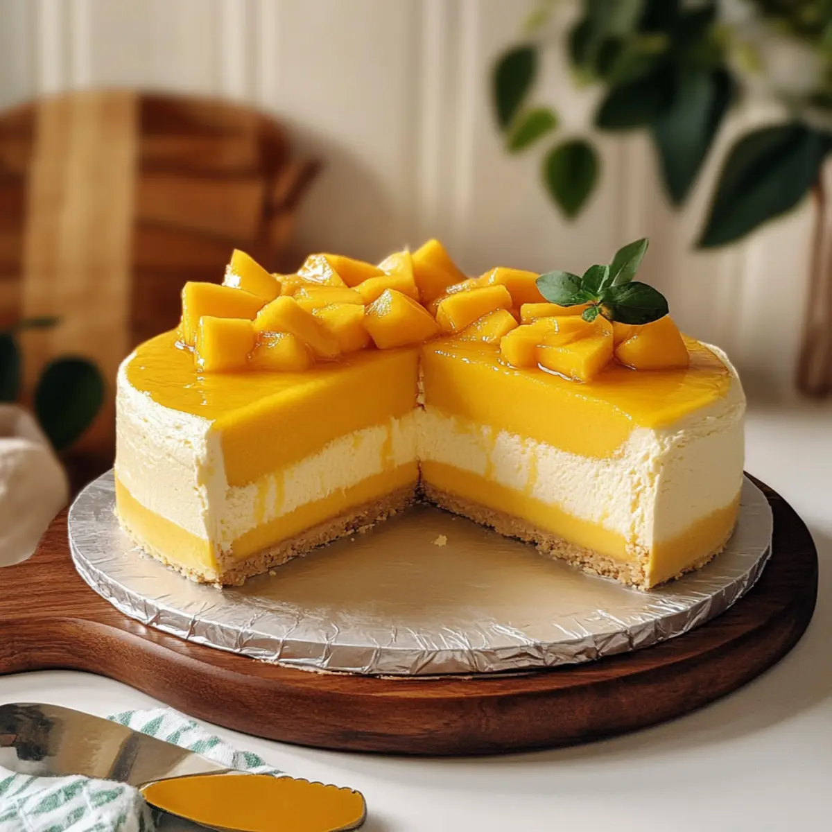 - Once the mousse is set, pour the cooled mango curd over it, spreading evenly. Cover and chill in the fridge for an additional 12 hours to set completely. Remove from the springform pan, garnish with fresh mango chunks and mint leaves if desired, and slice.