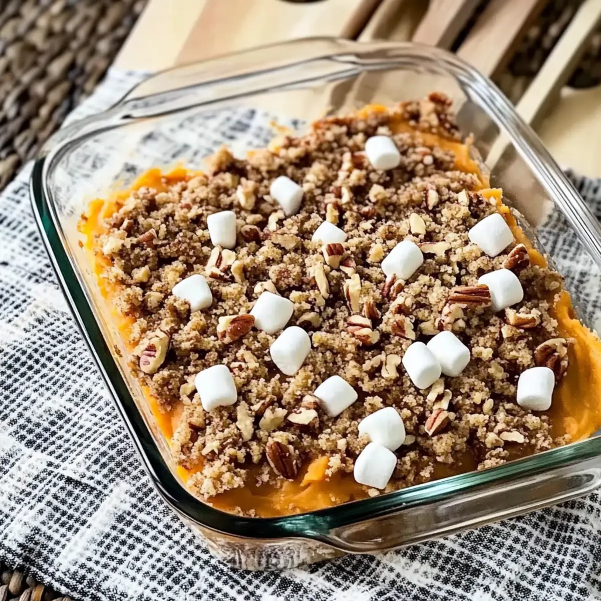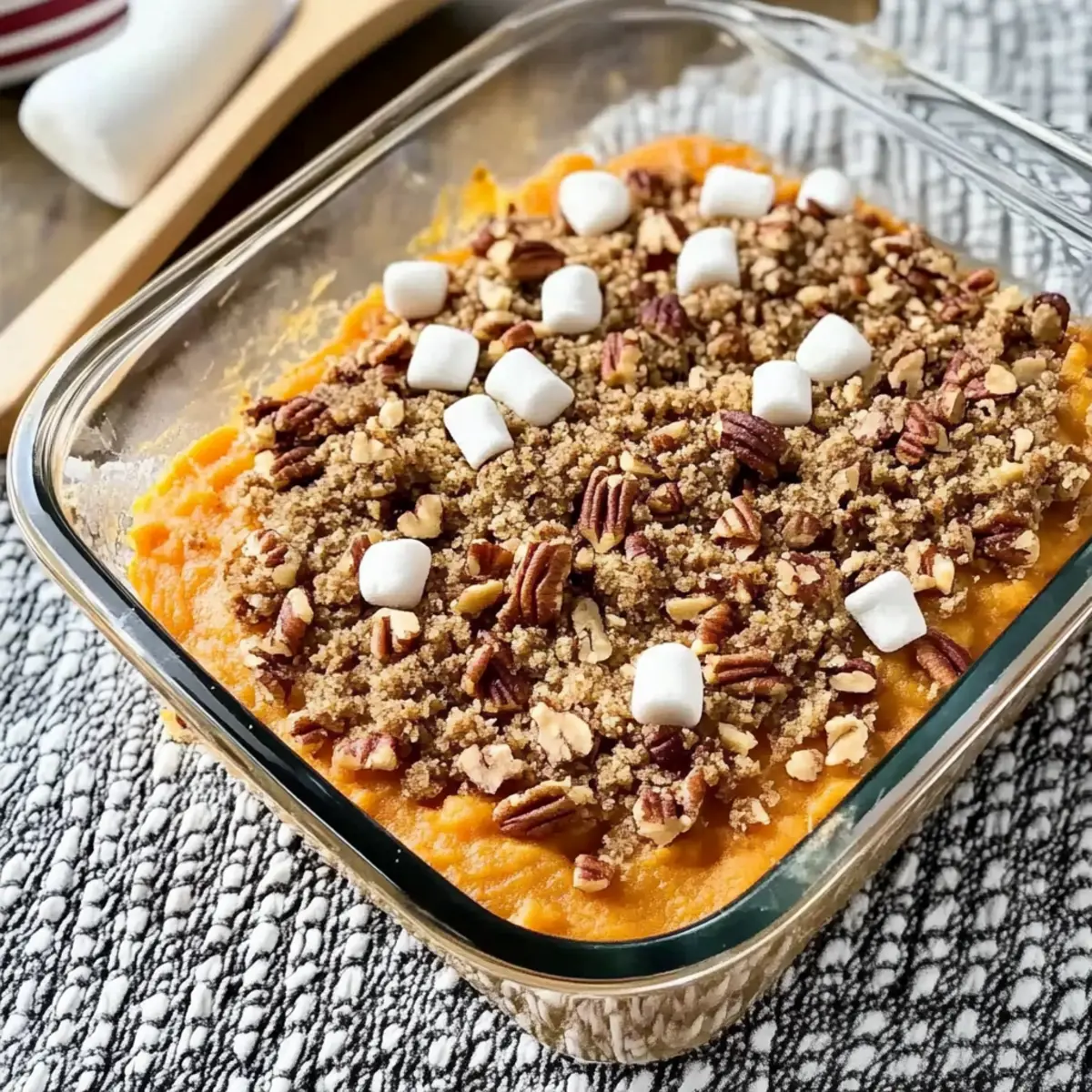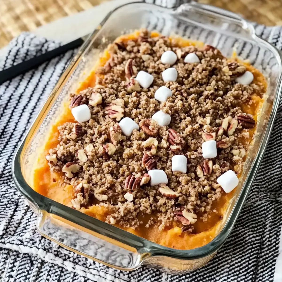 - Sprinkle the pecan topping evenly over the sweet potato mixture.
