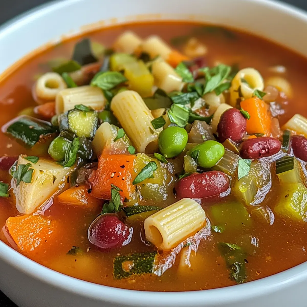 Hearty, rich flavors: This Minestrone soup combines a vibrant medley of vegetables with protein-packed beans for a robust taste that warms the soul.