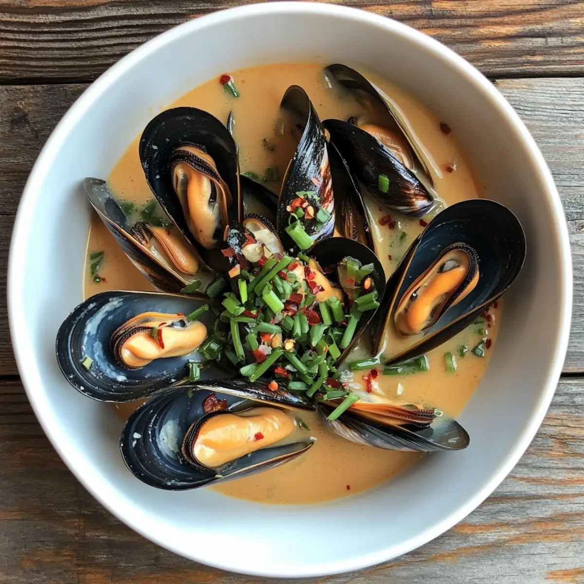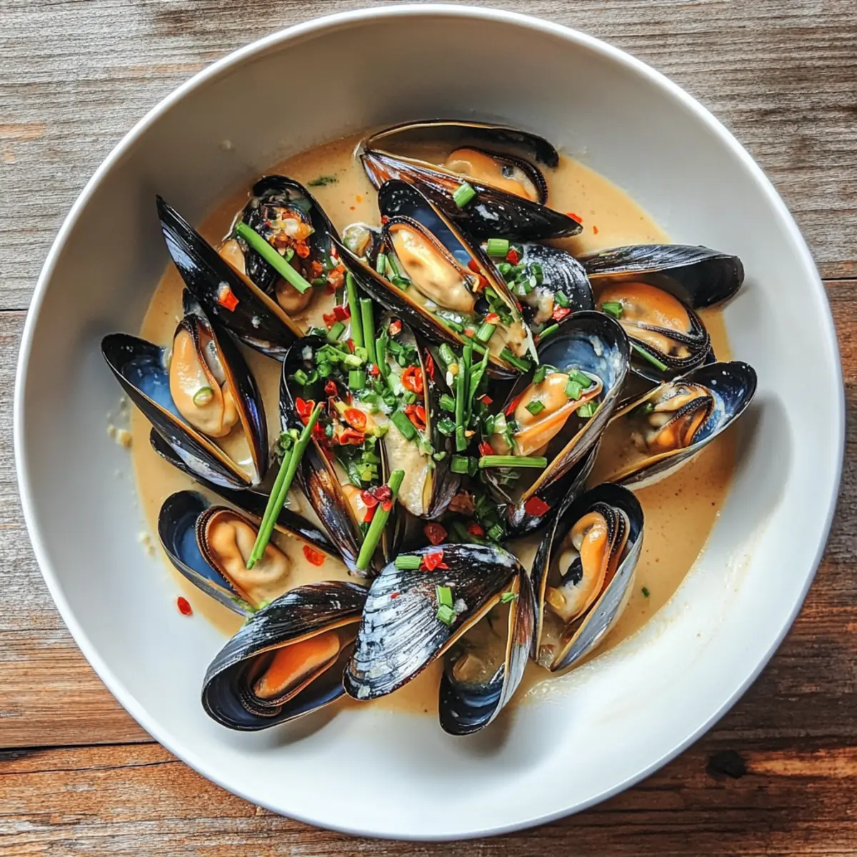 - Serve: Ladle mussels and broth into bowls; garnish with chives and drizzle with chili oil.