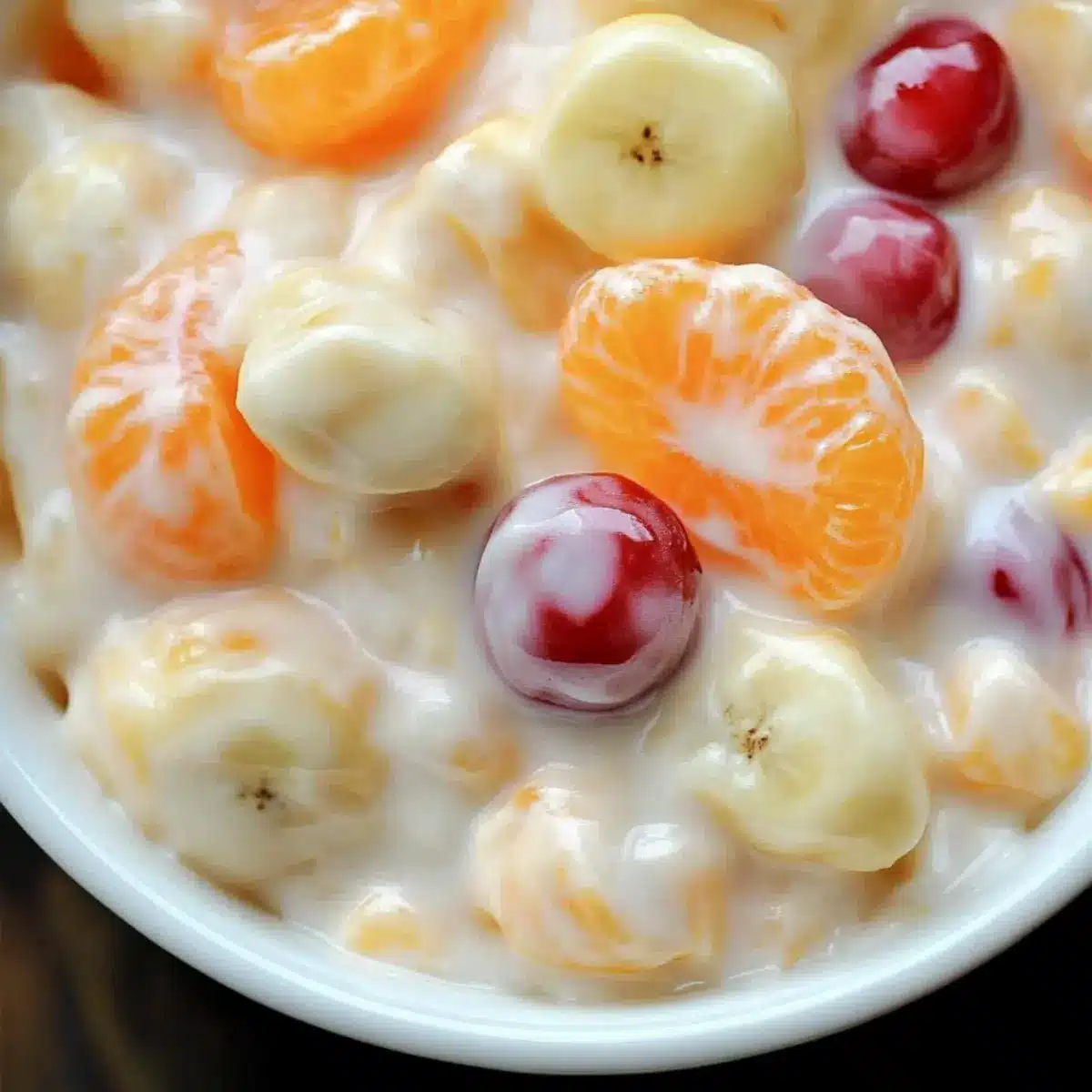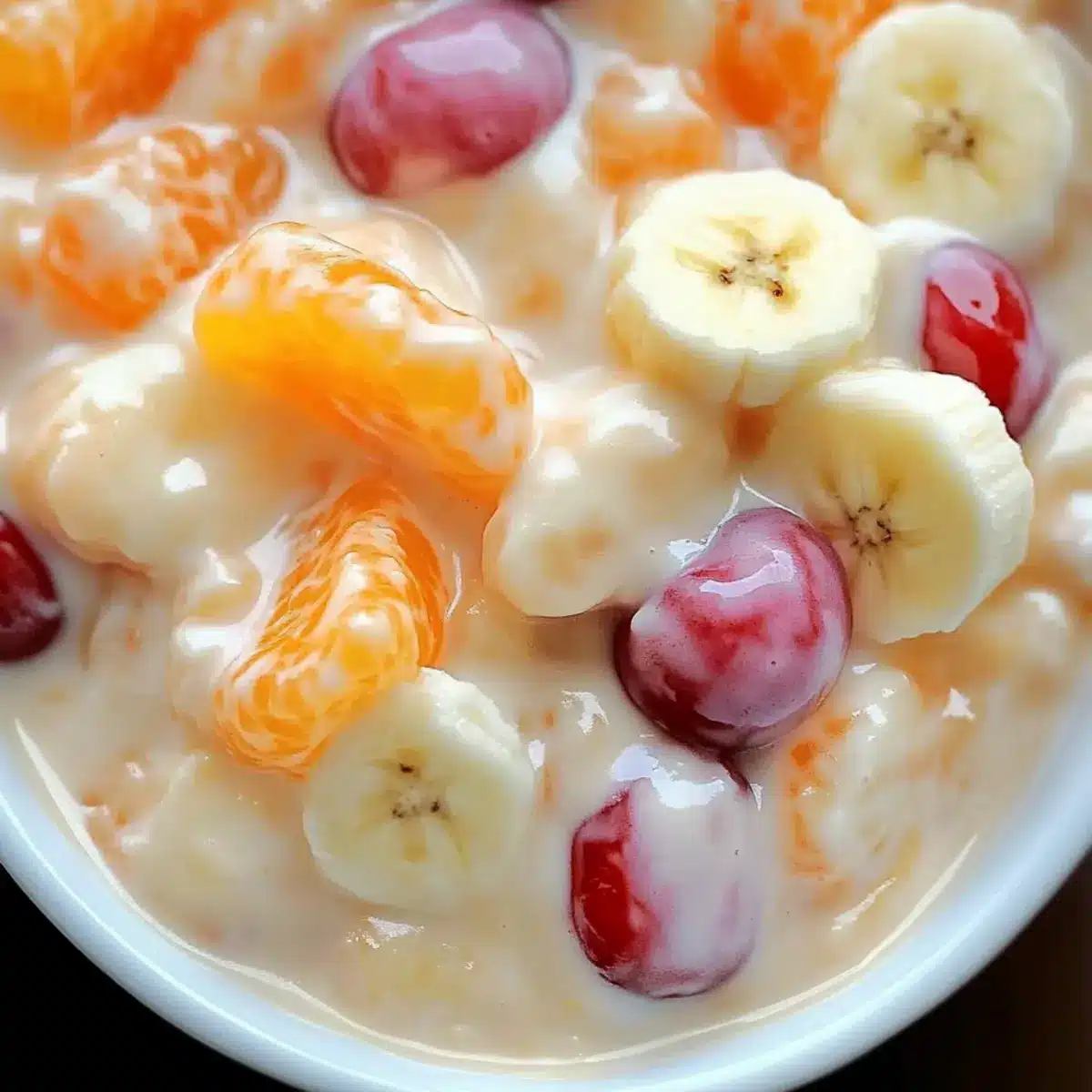 Just before serving, slice 2 fresh bananas and fold them delicately into the fruit mixture. Bananas should be added last to prevent browning. You’ll want them to blend harmoniously while maintaining their structure so that each bite provides both creaminess and fruitiness, adding to the delightful texture of the Orange Cream Fruit Salad.