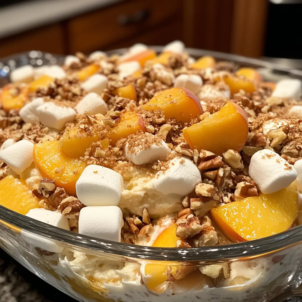 - Gently fold the chopped peaches into the cheesecake mixture and slowly stir in 1 cup of mini marshmallows.