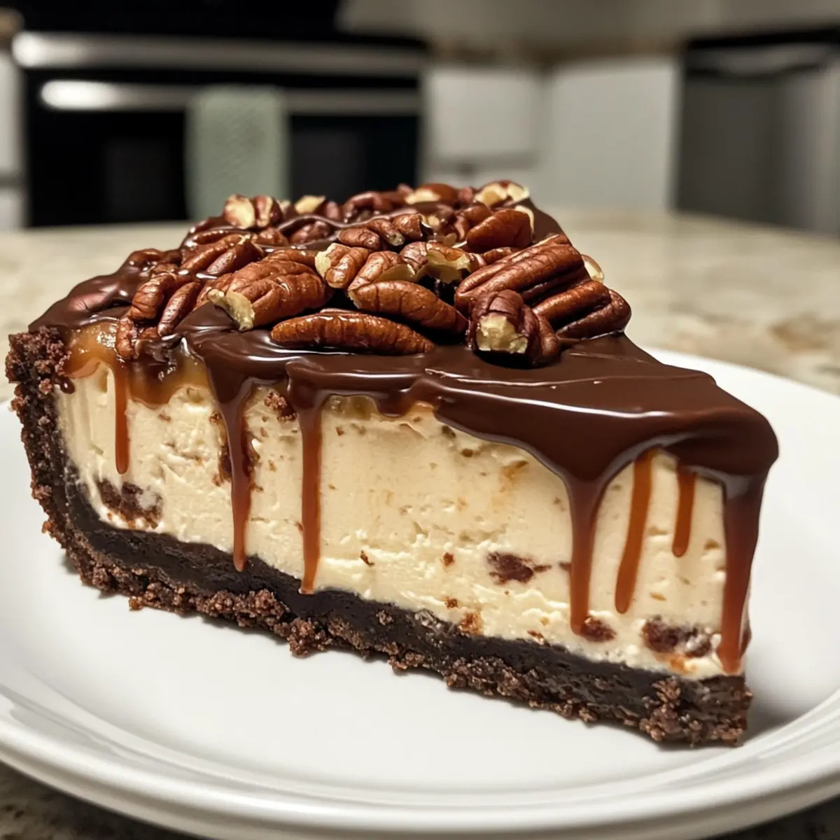 Refrigerate the cheesecake for at least 4 hours, or overnight for best results. When ready to serve, carefully remove the sides of the springform pan. Drizzle melted chocolate over the top and sprinkle with toasted pecans for added flavor and crunch. Slice with a hot, dry knife for clean cuts of your Salted Caramel Turtle Cheesecake.