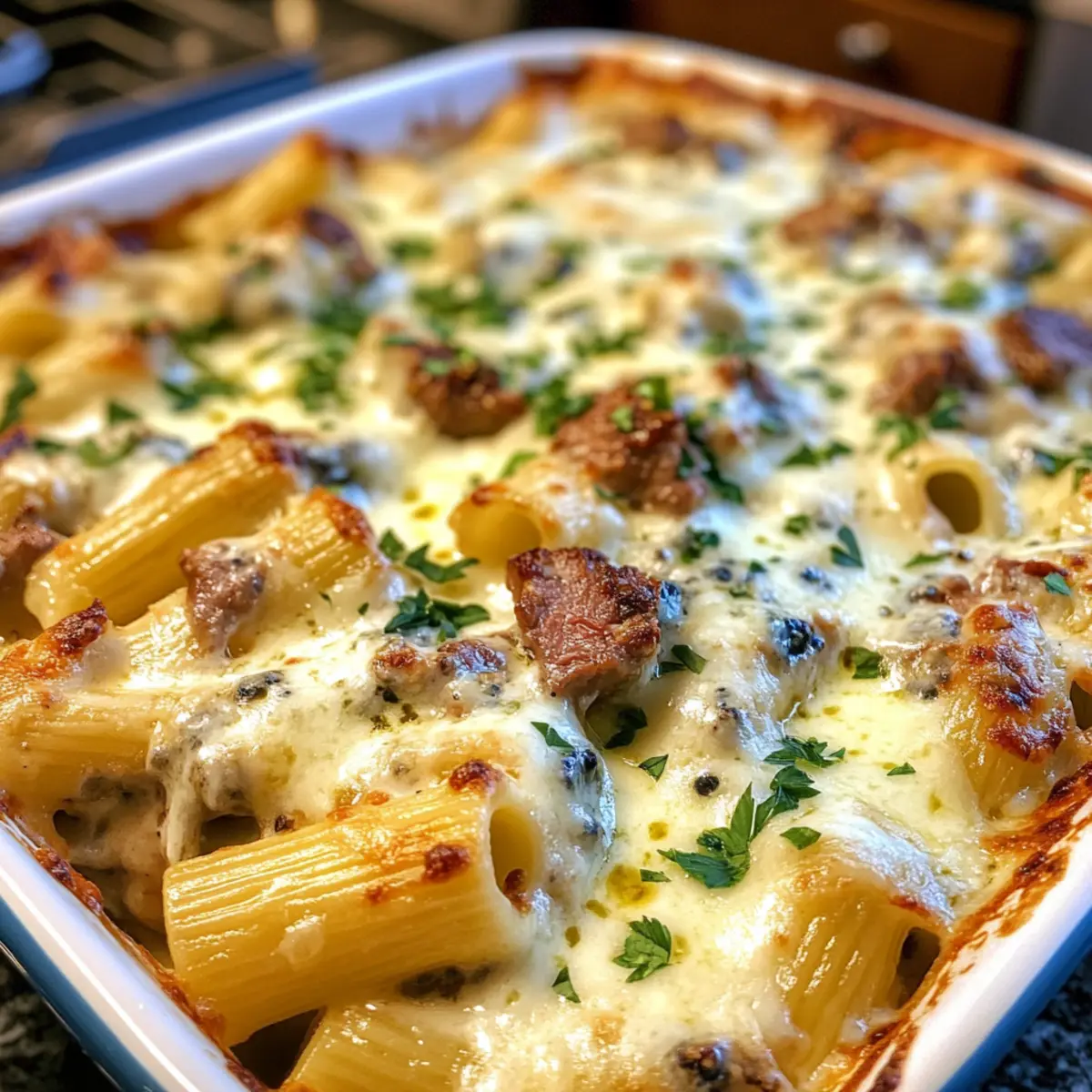 Once baked, remove the dish from the oven and let it cool for a few minutes. For a fresh touch, sprinkle 1/4 cup of chopped fresh parsley on top before serving. This garnish will add a pop of color and a hint of freshness, making your Steak & Blue Cheese Rigatoni Bake even more inviting and delicious!