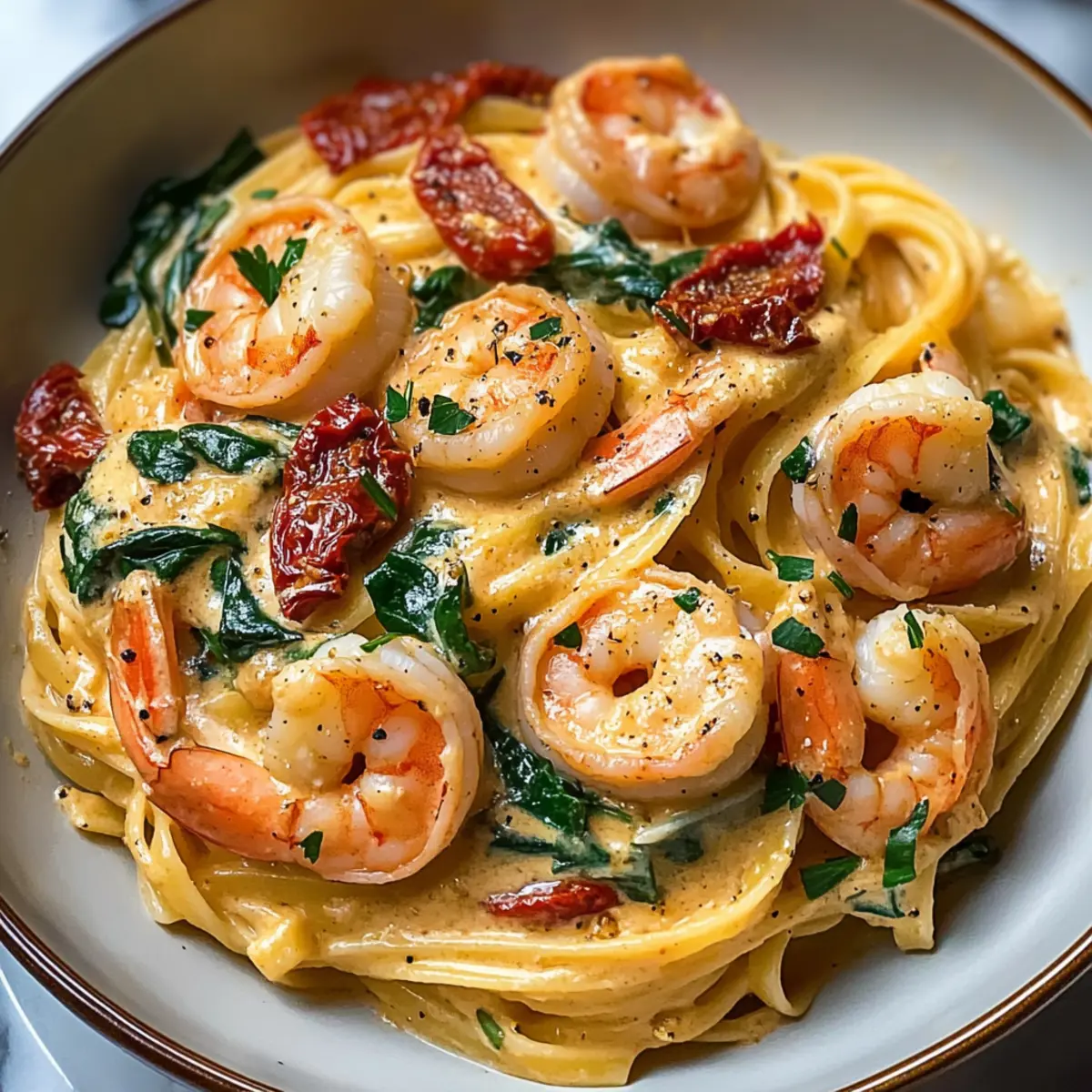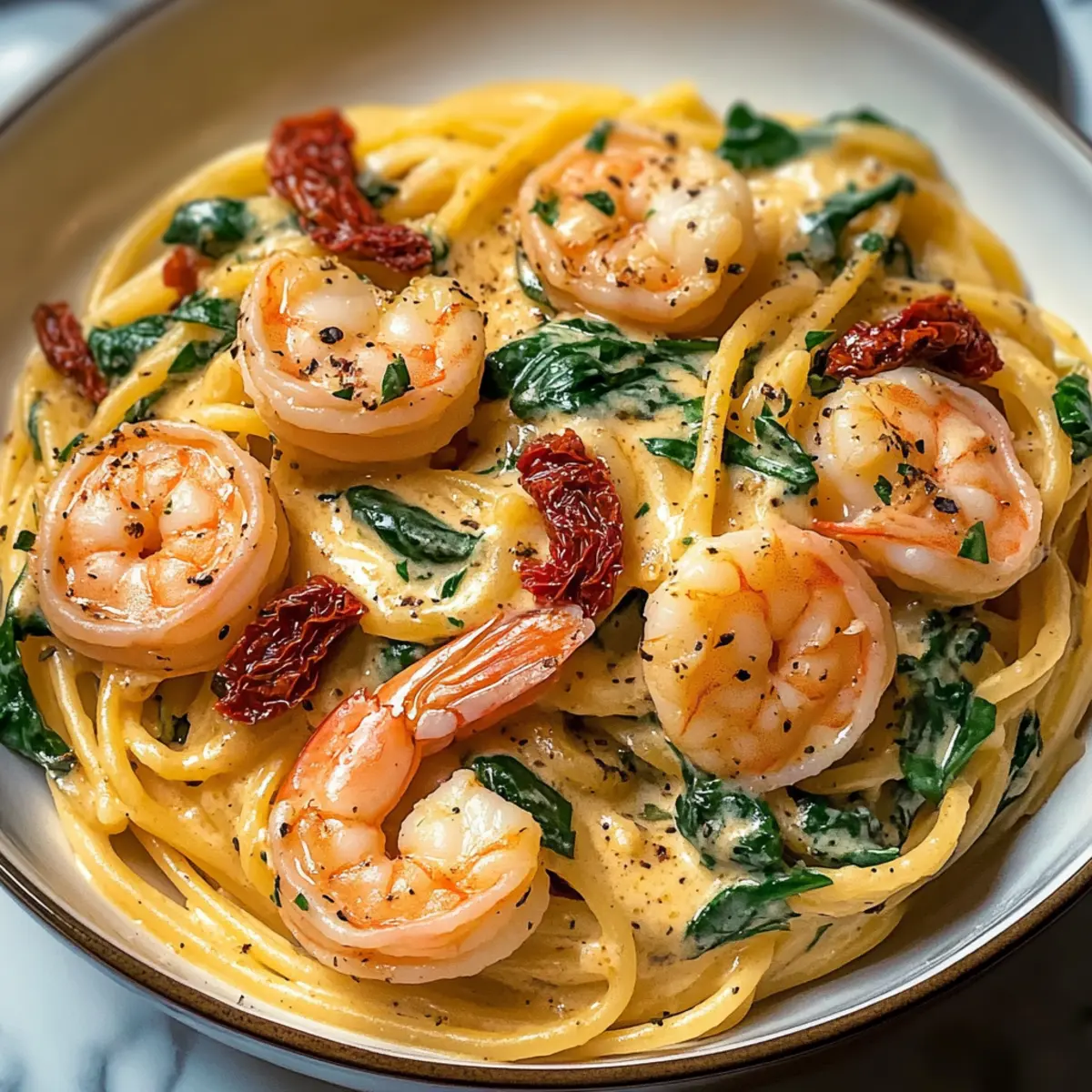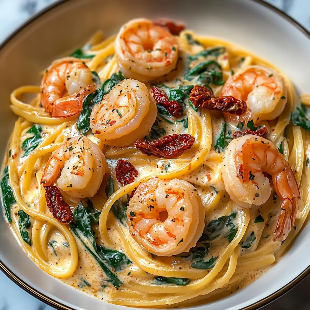 Rich and Creamy: The creamy sauce envelops shrimp, sun-dried tomatoes, and spinach, creating a harmony of flavors that feels indulgent.