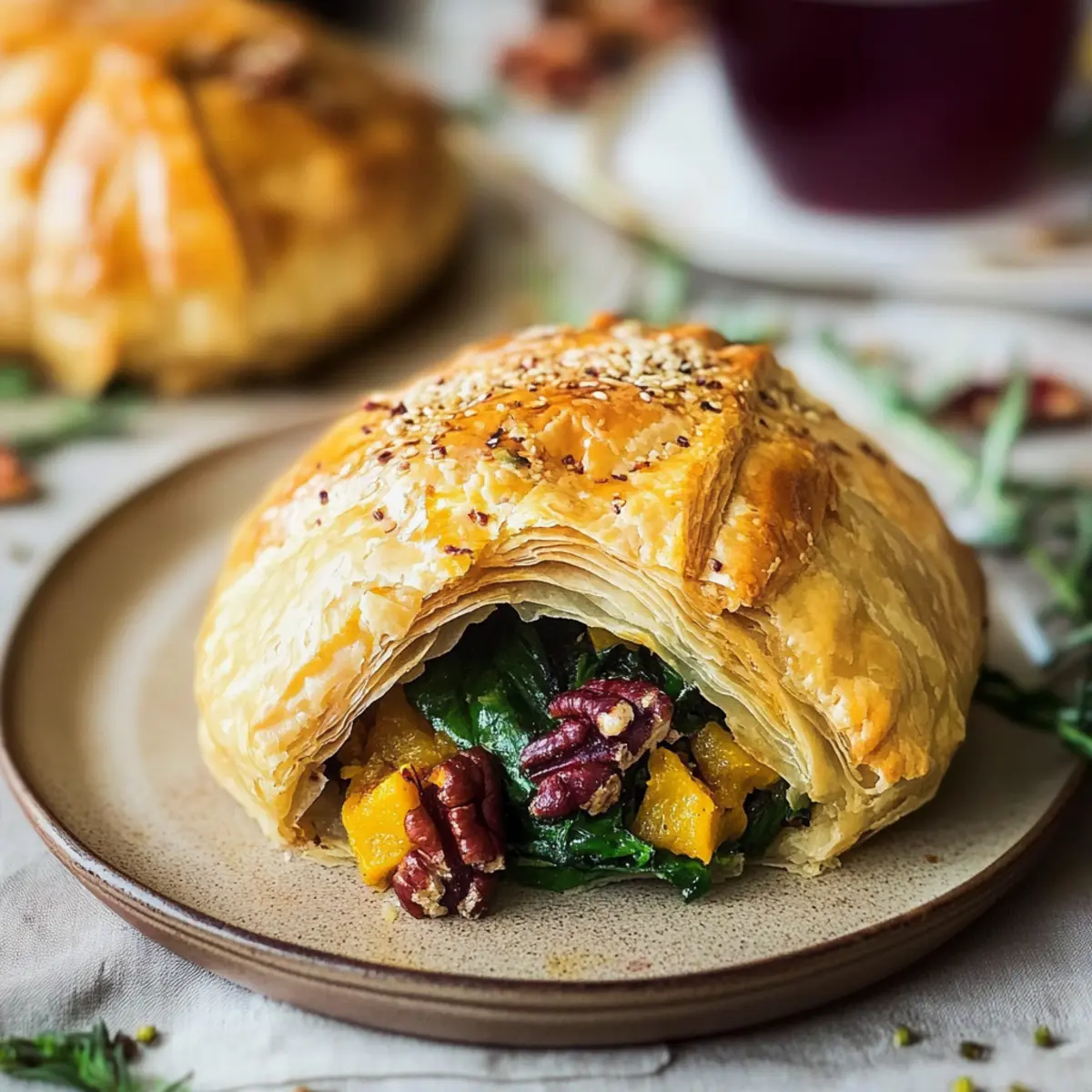 Preheat your oven to 200°C (400°F). On a lightly floured surface, roll out 1 sheet of vegan puff pastry to about 1/8 inch thick and cut into 4–5 circles, approximately 6 inches in diameter. Place a generous spoonful of the prepared filling in the center of each circle, followed by a tablespoon of breadcrumbs and 2 tablespoons of chopped pecans for added texture. Carefully fold the pastry over the filling and press the edges to seal, ensuring no filling escapes.